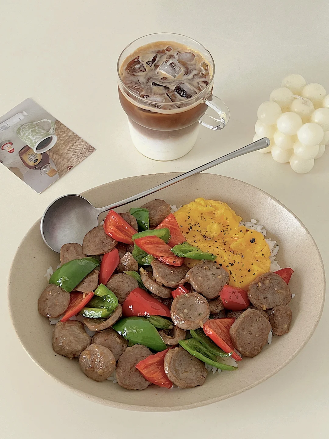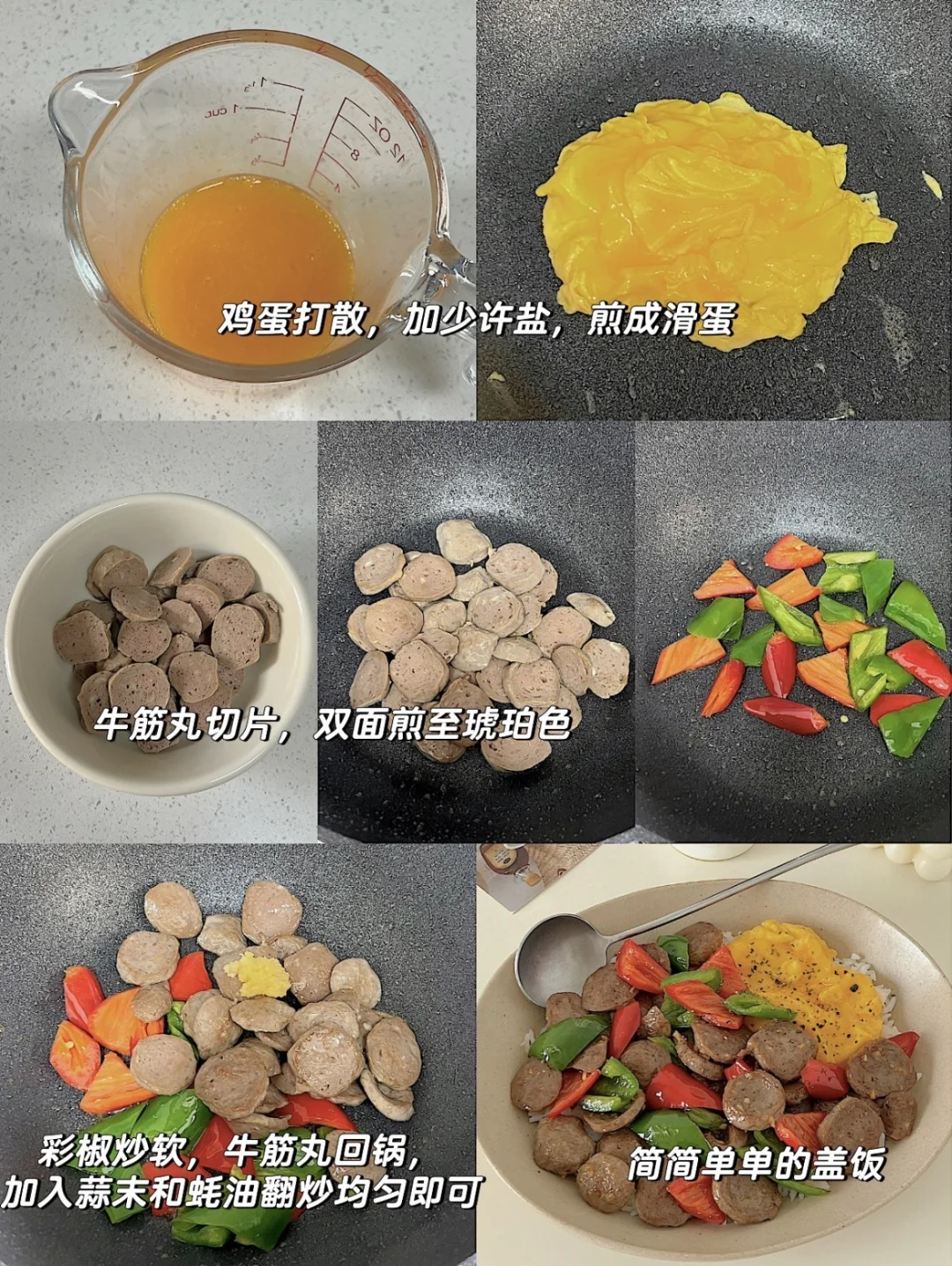 宅家一人食|辣椒炒牛筋丸滑蛋盖饭🍱拿铁☕️