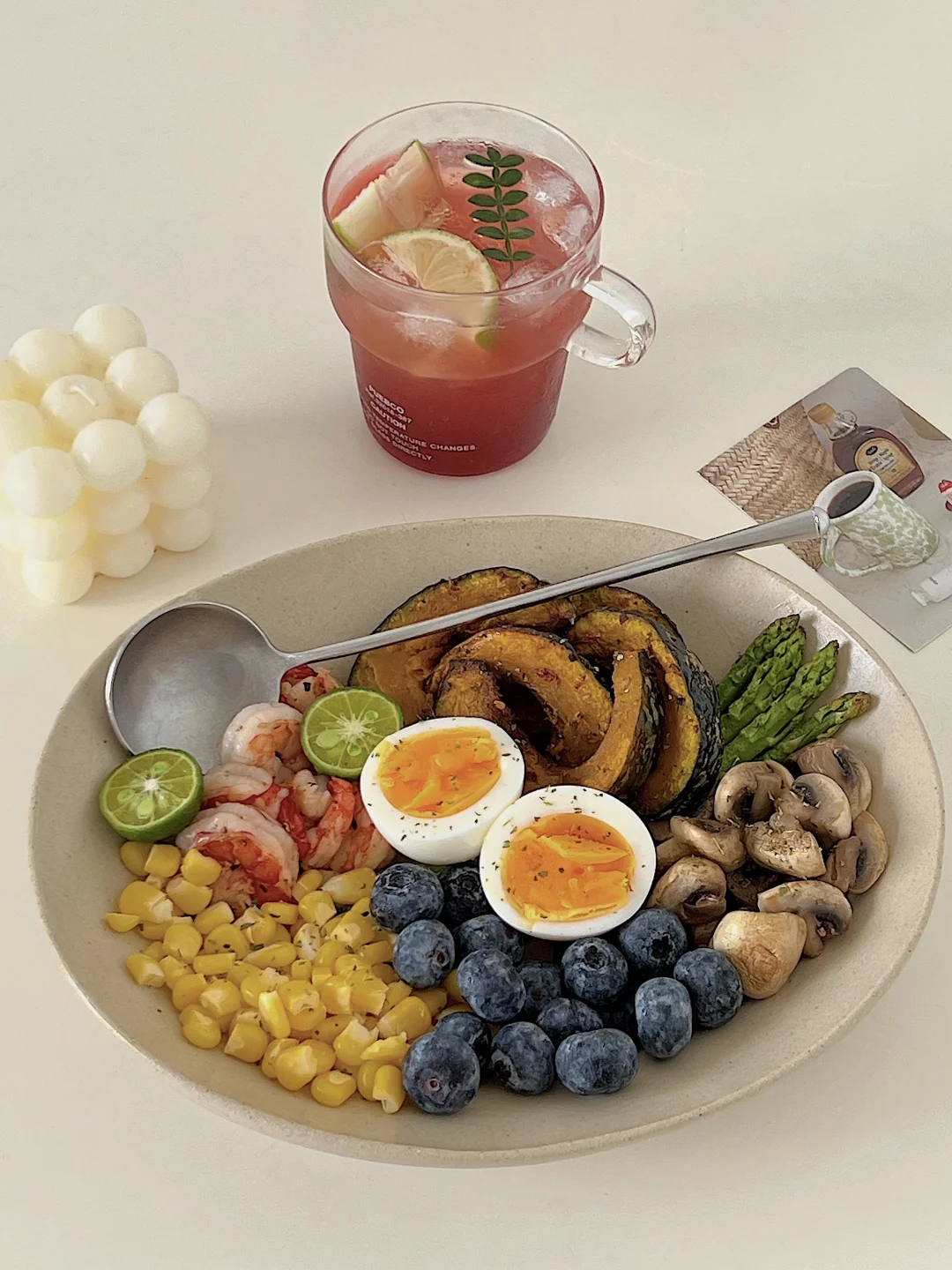 干净饮食|贝贝南瓜芦笋虾仁沙拉🥗石榴汁🍹