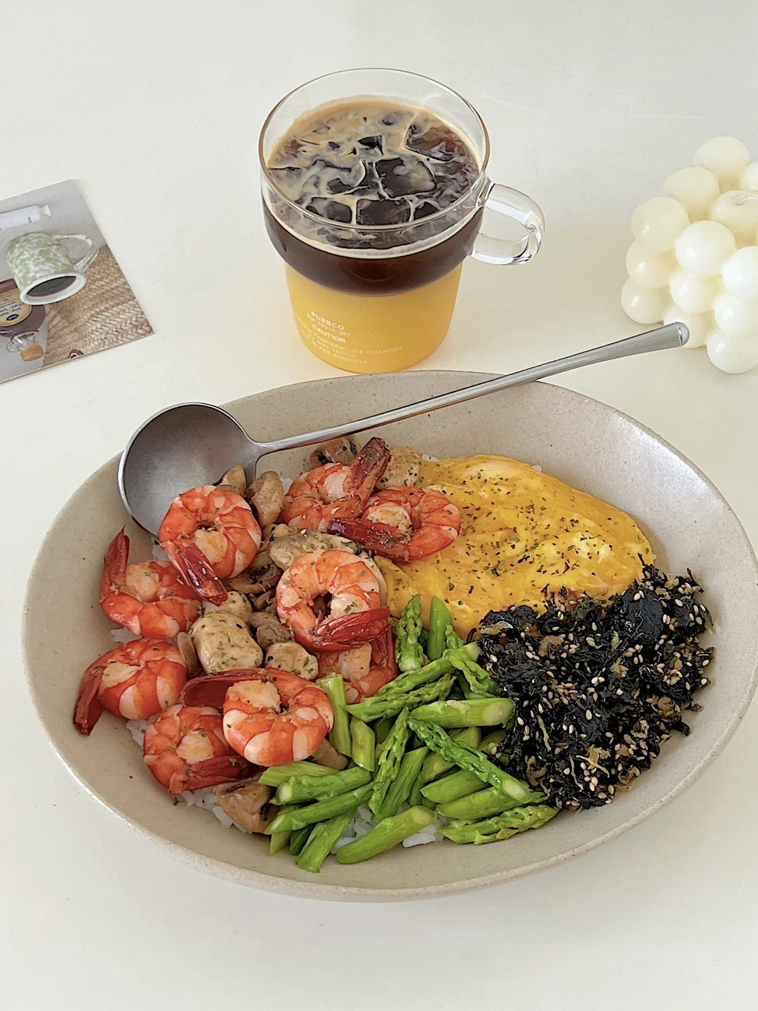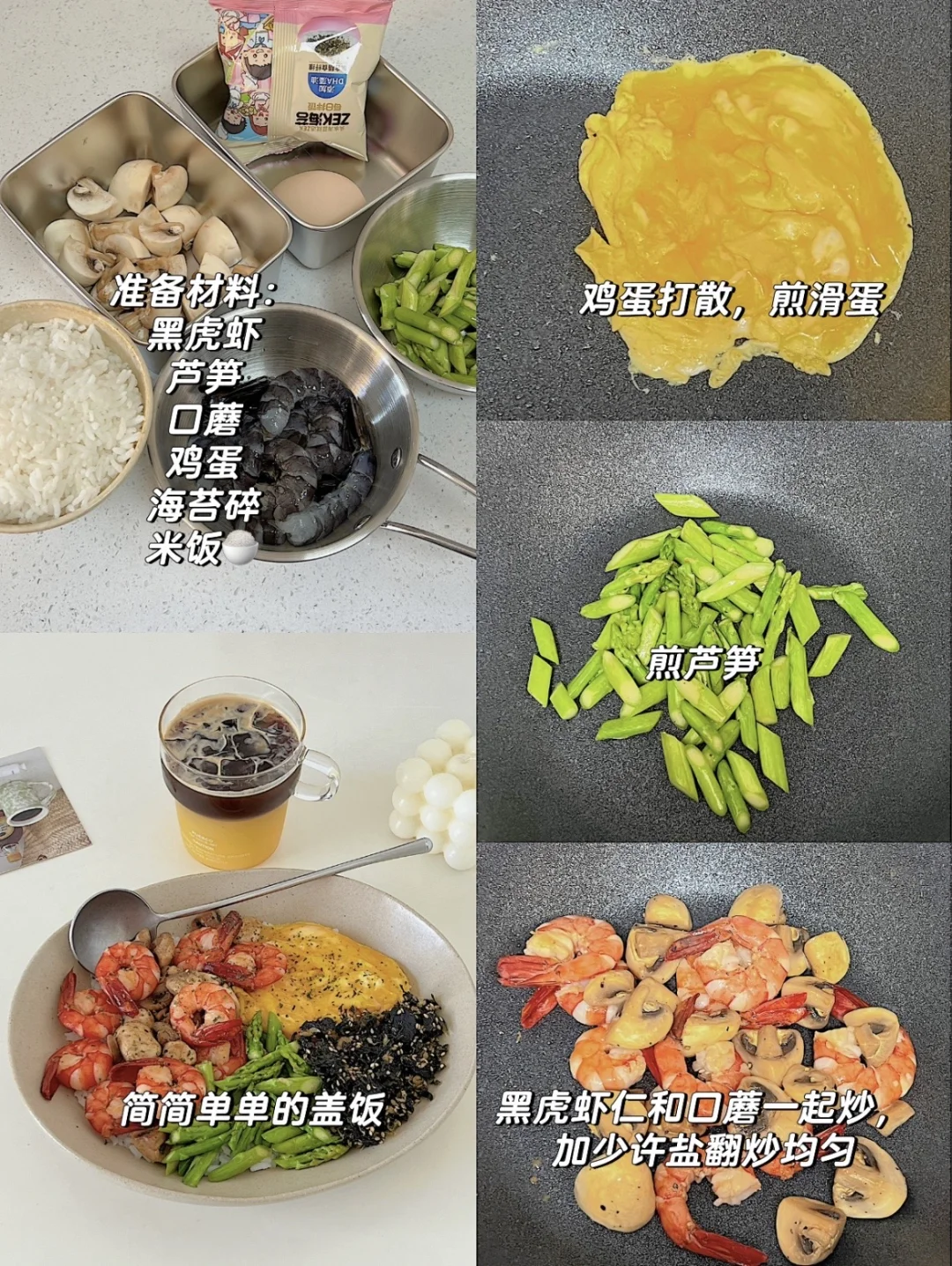 一人食|芦笋虾仁口蘑滑蛋盖饭🍱橙C美式🍊