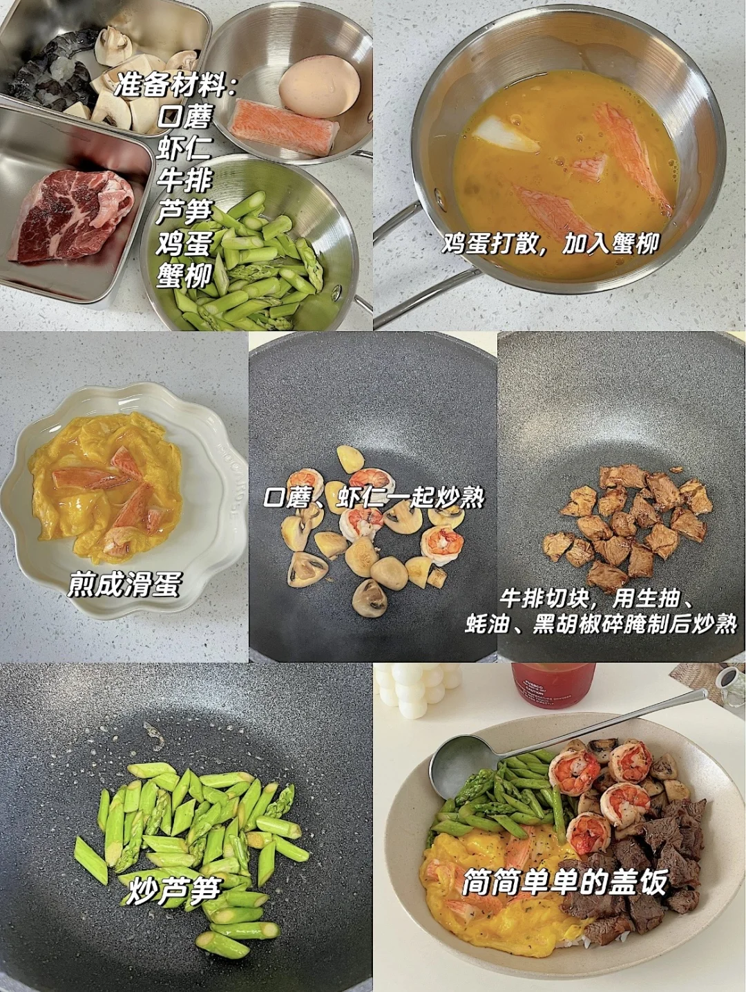 拒绝没有味道的水煮菜, 宅家自己做的漂亮饭[拍立得R] ✨蟹柳炒饭🥣 ✨贝贝南瓜芦笋虾仁沙拉🥗 ✨芦笋虾仁口蘑滑蛋盖饭🍱 ✨牛排蟹柳滑蛋芦笋盖饭🍱 ✨辣椒炒牛筋丸滑蛋盖饭🍱 ✨牛肉生菜虾仁滑蛋盖饭🍱 吃饭迷茫期就来看看吃什么 优质蛋白,维生素,碳水看过来[清单R] 喜欢吃牛肉和虾[红色心形R]