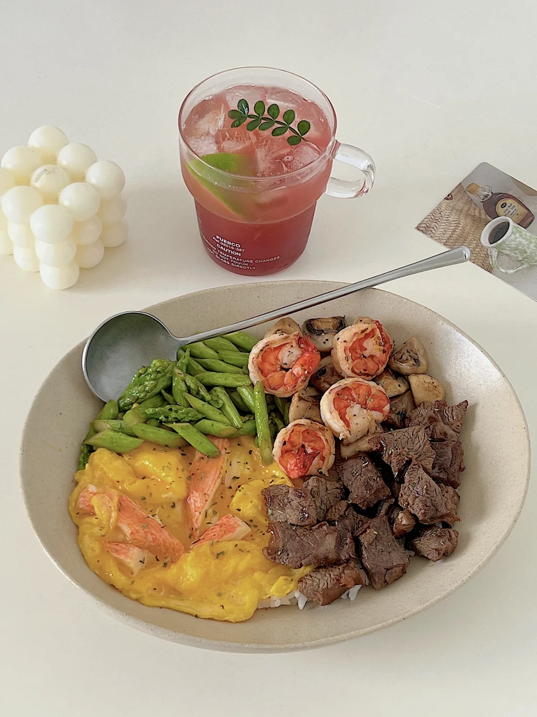 一人食|牛排蟹柳滑蛋芦笋盖饭🍱石榴汁🥤