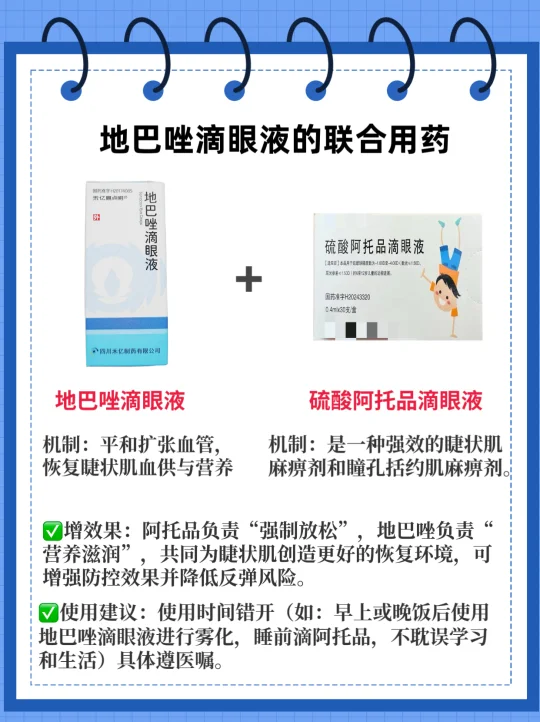 ✅增效果:阿托品负责“强制放松”,地巴唑负责“营养滋润”,共同为睫状肌创造更好的恢复环境,可增强防控效果并降低反弹风险。