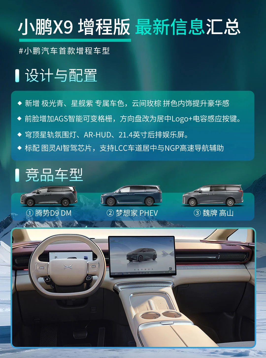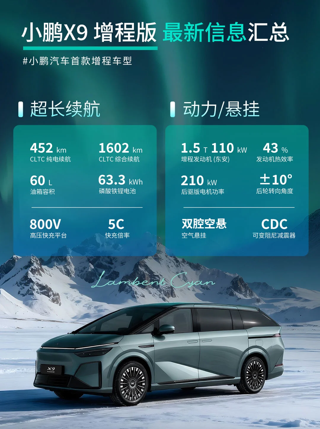 小鹏首款增程车-X9增程版最新信息发布,将搭载63.3度超快充磷酸铁锂增程大电池、纯电续航452km,加上60L大油箱综合续航可达1602km。