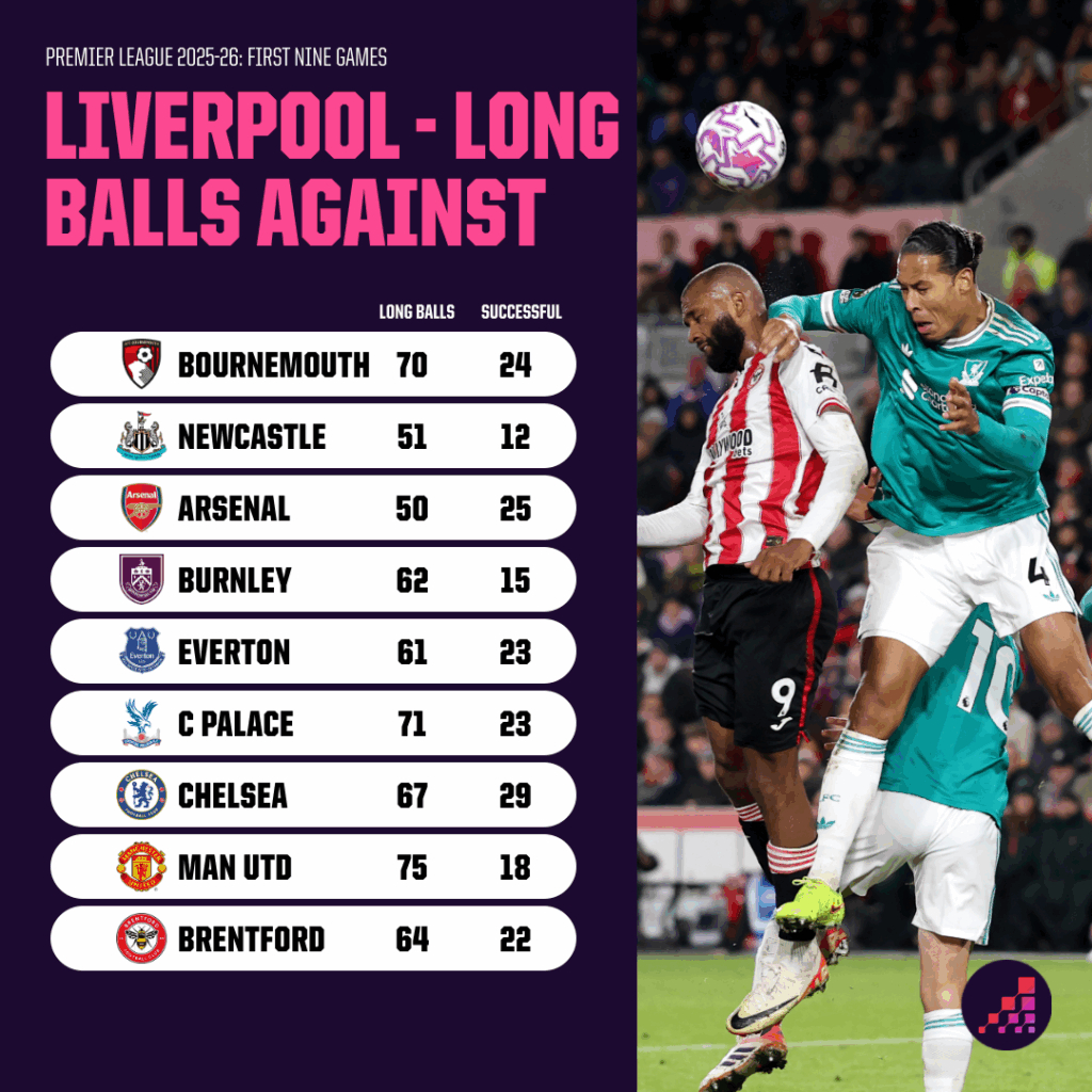 因此,本赛季九场比赛下来,所有对手都频繁用长传对付利物浦,也就不足为奇了。