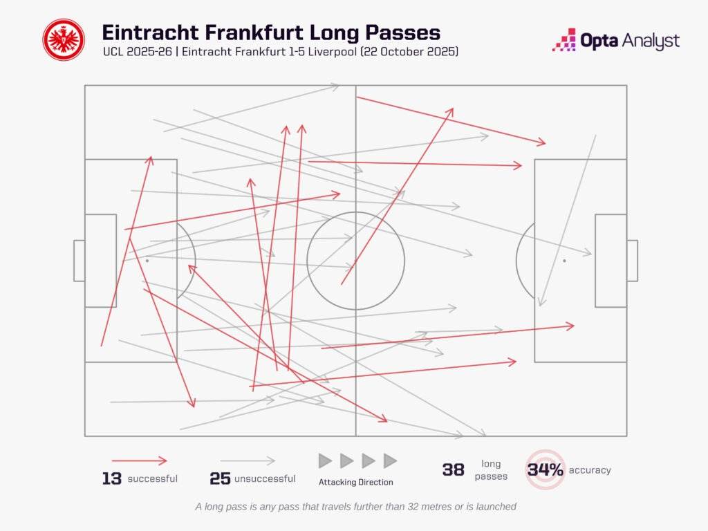 对手的长传并非总能直接制造射门机会——本赛季英超,尚无球队对利物浦的成功长传数超过29次。但长传能暂时打乱利物浦的阵型,而红军在阵型被打乱时,往往难以调整。尤其是左侧新援凯尔凯兹尚未完全适应,右侧边卫轮换又不稳定,进一步放大了这一问题。