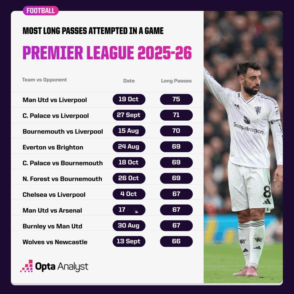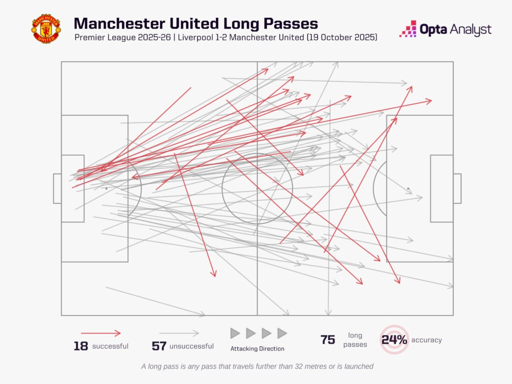 尽管这番话被部分人解读为“暗讽”,但数据不会说谎:曼联在安菲尔德的294次传球中,有75次是长传(长传定义为距离至少32米,不含界外球、门将手抛球及传中)。长传占比达25.5%,这是曼联自2017年12月对阵阿森纳(27.9%)以来,英超比赛中长传占比最高的一次。
