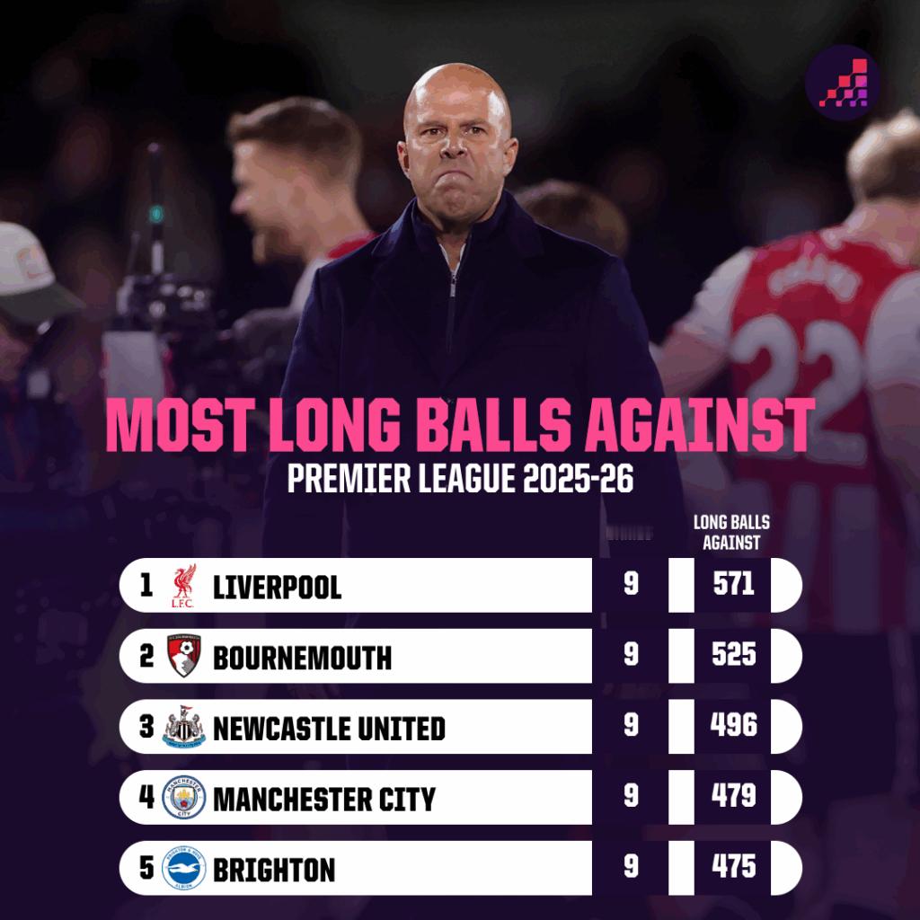 但曼联一役绝非个例——本赛季英超,利物浦已被对手轰出571次长传,比其他任何球队至少多46次;而伯恩茅斯(525次)是唯一另一支被对手尝试长传超500次的球队。