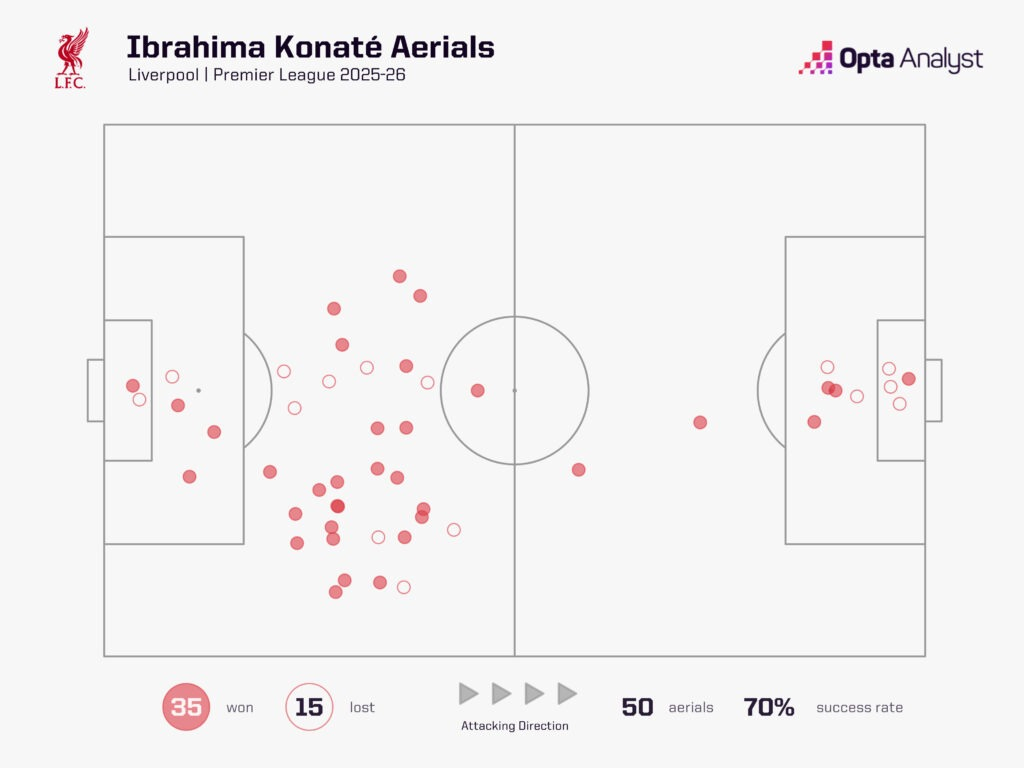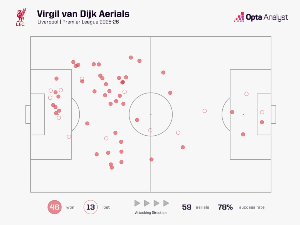 其中,范戴克本赛季赢下46次空中对抗(59次尝试,成功率78%),比英超其他任何球员至少多7次;他的中卫搭档科纳特赢下35次(50次尝试,成功率70%),高居英超第三。