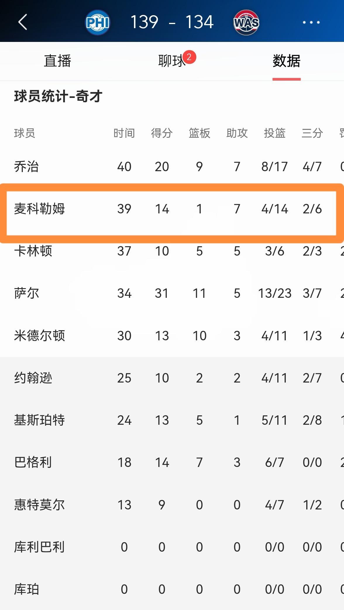 奇才老将麦科勒姆真是难堪大用!在今天奇才主场以134:139输给76人的比赛中,麦科勒姆的进攻效率非常的低效。全场比赛下来,麦科勒姆首发出战39分钟,投篮14中4,其中三分球6中2、罚球4中4非常低效的得到14分。 作为奇才的核心和领袖之一,麦科勒姆在如此备受奇才球迷期待的一场比赛中打出这样糟糕的表现是不及格的。