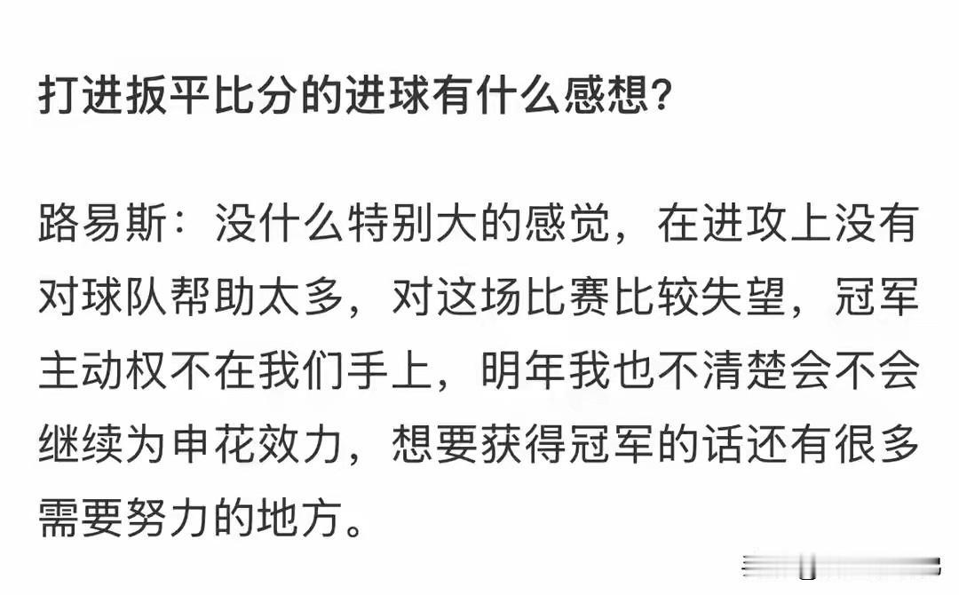 路易斯说了实话,离开申花也好,未来祝你好运! 没能拿下大连英博,无论是球员还是球迷都非常失望。 这么好的机会没把握住,被抨击扶不上墙确实无话可说。 赛后路易斯接受采访说了实话,难掩失望心情。 虽然攻入点球,但没能取胜,这粒进球的意义大打折扣。 倘若这是逆转进球,路易斯必定会对比兴奋无比。 没什么特别大的感觉是内心真实写照,甚至进球无法改变沮丧心情。 路易斯提到:在进攻上没对球队帮助太多。 一切确实如此,本以为路易斯知道将离开才选择手术。 后来才发现并非如此。 在最后时刻复出,看得出来身体根本没彻底恢复,为了冠军强行从病床上爬起。 他已经尽力了,一方面发挥不出100%的战斗力,另一方面球队战术确实让他别扭。 对此,球迷也无法过多责怪。 失去争冠主动权很被动,路易斯的话证明球员心里都清楚,只是原因有很多。 以目前的情况看,下赛季路易斯离队板上钉钉,说再见的日子不远了。 最后那句话也说明,球员心里清楚,申花想夺冠还差点意思。 以目前的人员配置和战术打法,争冠确实还有很长的路要走。 前锋需要改变,申花需要适合的球员。 基于这点,路易斯留下意义不大,离开对双方都好。 能否改变过于依赖边路进攻战术? 所有弱队都知道如何对付申花,斯卢茨基能否让进攻更丰富? 这些都是球队需要做的事,因此路易斯的话一点没错。 足球就是这样,看似强弱分清却未必能轻松拿下,否则还踢什么? 这一轮,榜首三强纷纷掉链子,也足以说明足球不是比纸面实力。 心态、临场发挥、偶发情况都会左右一场比赛的结果,谁也不是神仙。 路易斯是个敬业的球员,在申花虽谈不上成功,但还是祝他未来好运。