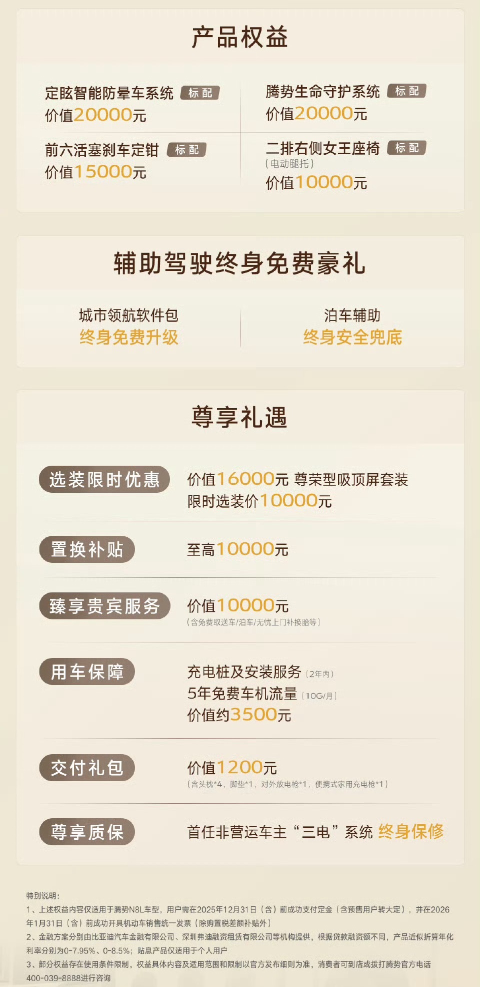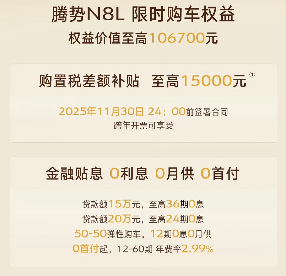 一台家人全票通过的车大六座suv首选腾势n8l29.98万起腾势N8L 腾势N8L终于上市了,相比较之前32W的价格,这次直接来到了29.98万,以N8L的产品力,这个价格真的就是白送了。