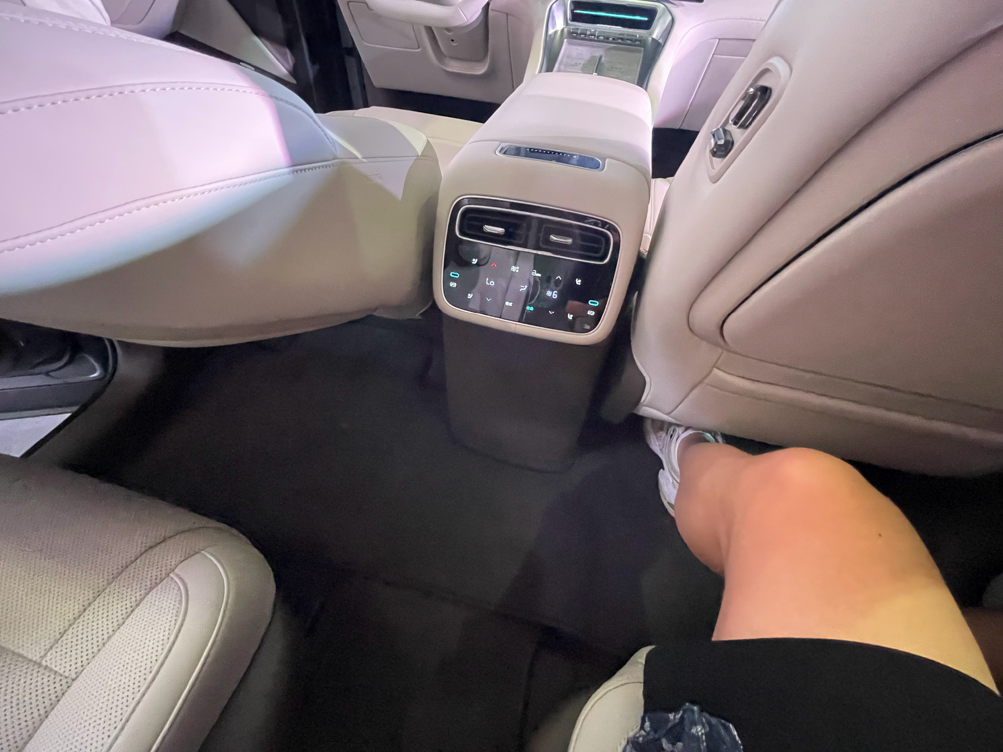 首先大六座那是真的大,图里可以看到前排放倒后是这样,大家自己看我的腿多舒展。而且我把第一排调节的很宽敞了,第二排还有这么大,最离谱的是第三排也不顶脚。