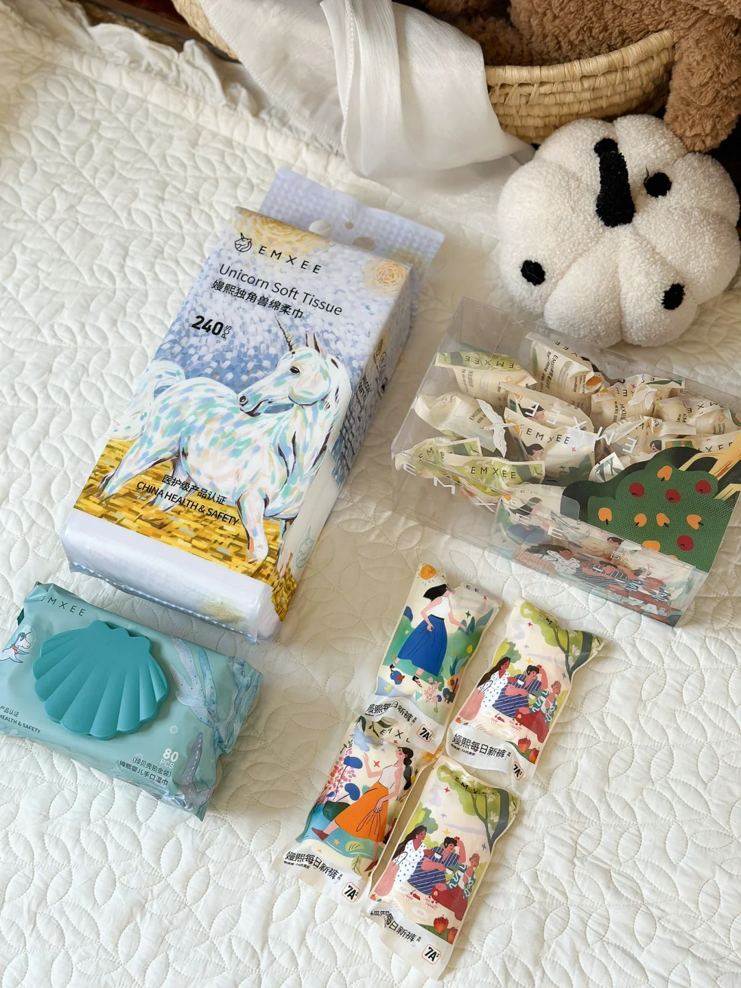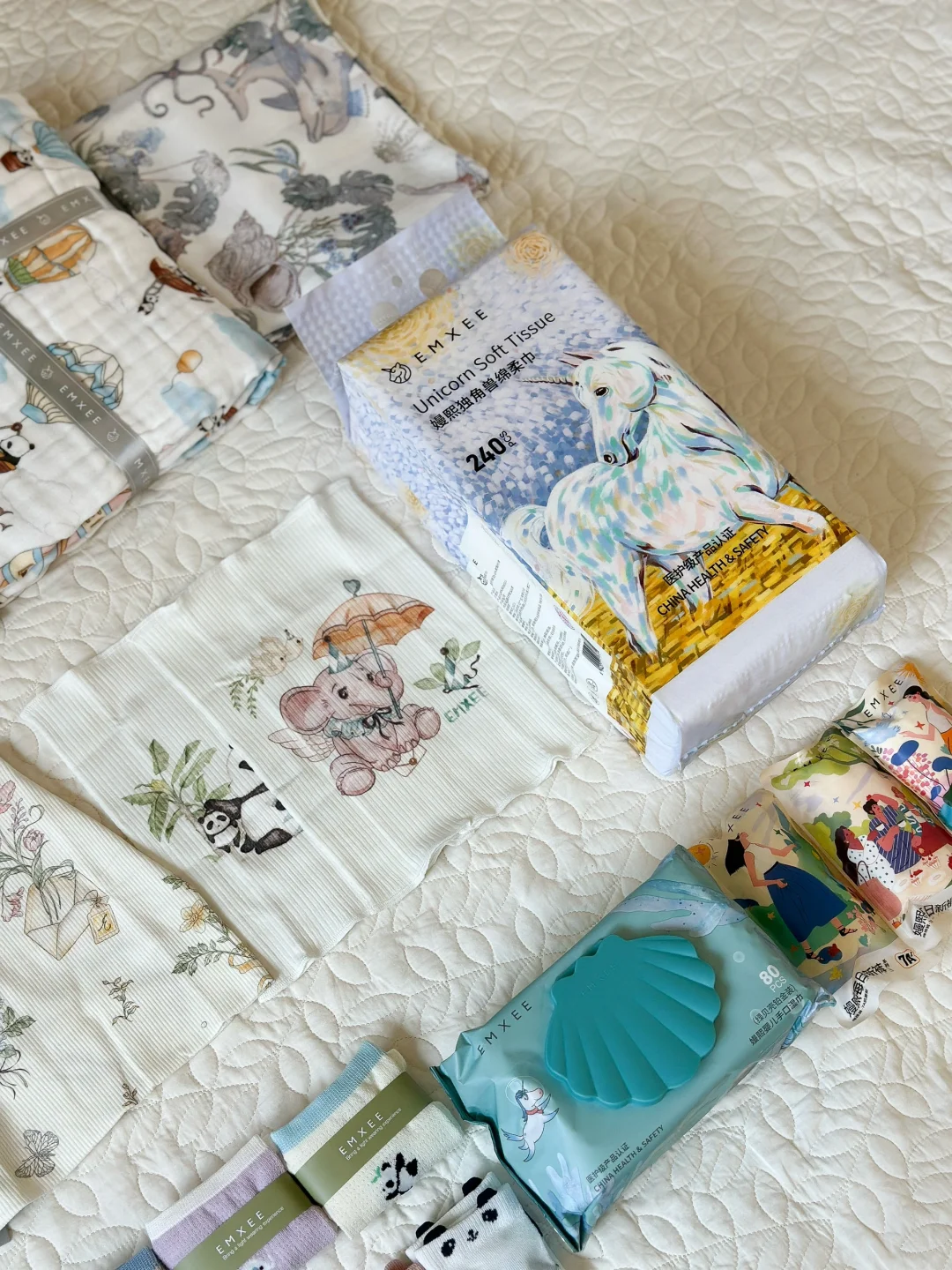 准备了心爱的月子服之后,还准备了他们家的其他待产好物,比如宝宝浴巾、包单、果果衣、月子帽、宝宝肚围、月子袜和宝宝袜子、湿巾、7A一次性内裤,一站式购齐啦!