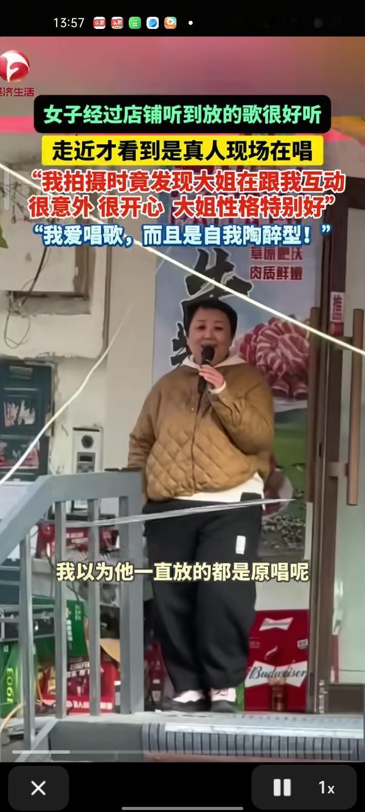 10月28日,黑龙江哈尔滨。女子经过店铺时放的歌很好听,走近一看才知道有人在演唱,周围没有任何观众。当事人王女士称,自己拿手机拍时,发现大姐跟自己互动,感到很意外又很开心,大姐性格特别好,氛围也特别好。 大姐也说,自己是一位公交司机,平时爱唱歌,希望能给大家带来开心和快乐。