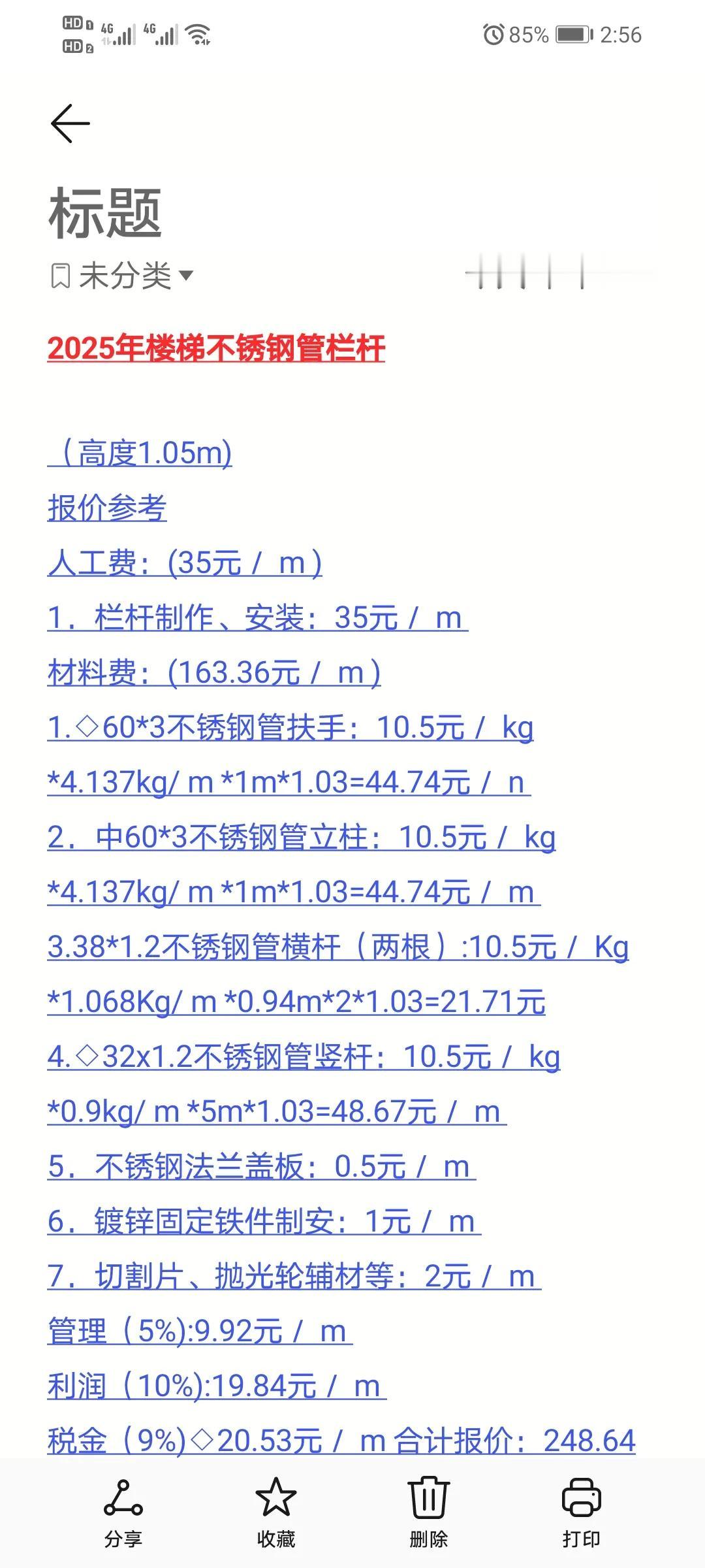 家人们,今天来给大家讲讲2025年楼梯不锈钢管栏杆高度1.05米的报价参考,准备装修或者做工程的可千万别错过! 先来说说人工费,每米35元,就只是栏杆制作和安装哦。 再看看材料费,那可就细啦。603的不锈钢管扶手,每米要44.74元;同样规格的不锈钢管立柱,也是44.74元每米;381.2的不锈钢管横杆两根,每米21.71元;32*1.2的不锈钢管竖杆,达到了48.67元每米;还有不锈钢法兰盖板0.5元每米,镀锌固定铁件制安1元每米,切割片、抛光轮辅材等2元每米,加起来一共163.36元。 另外,管理费用每米9.92元,利润每米19.84元,税金每米20.53元。最后合计报价每米248.64元。 这里面啊,大家能看出来,材料费占比不小,所以选材料的时候可得多上心。而且管理、利润和税金这些也不是小数目,做预算的时候都得考虑周全。总之,别觉得做个楼梯栏杆很简单,这里面的门道可多着呢,每一项费用都得精打细算,不然很容易超支哦!大家在做的时候一定要心里有数,别被坑了。