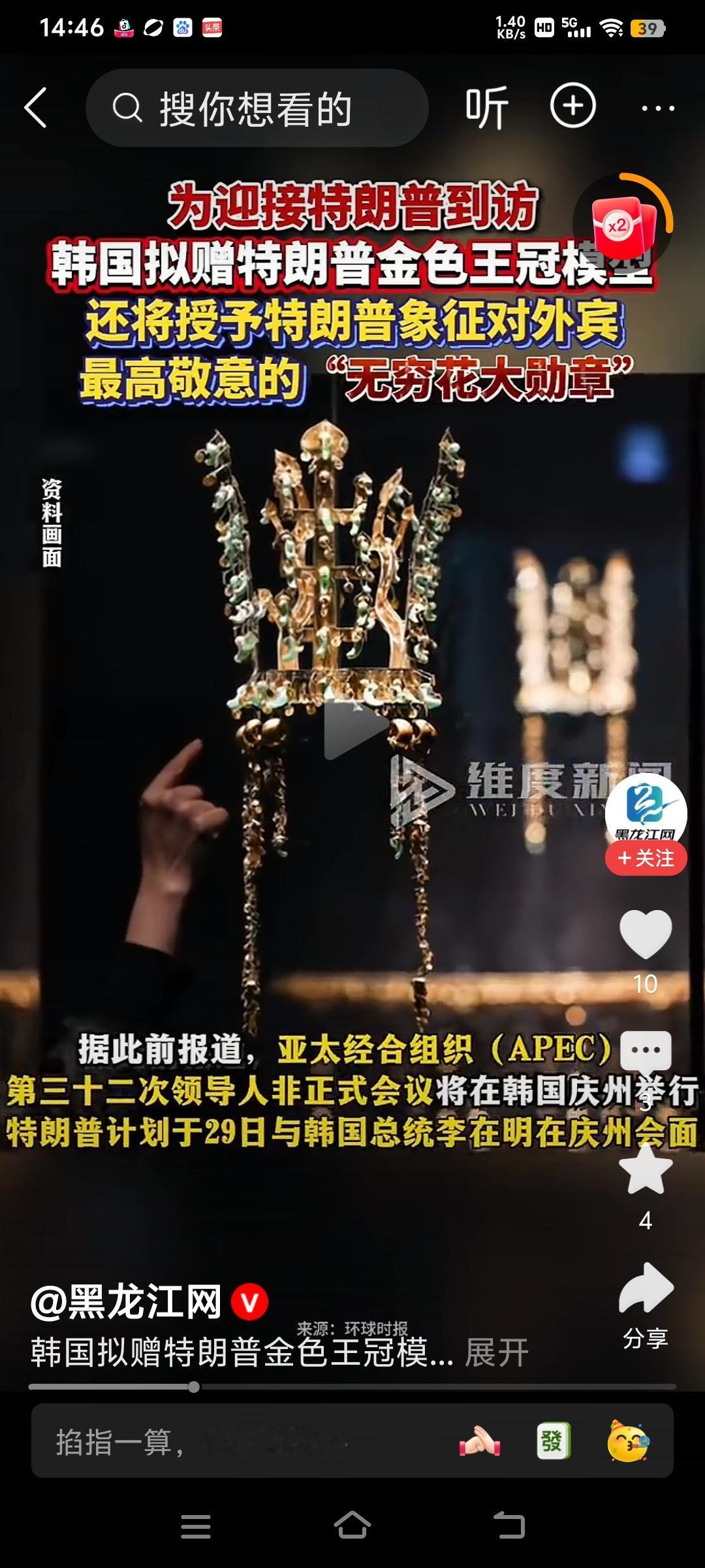 韩国跪舔特朗普又加码了,不只是要授予象征对外宾最高敬意的“无穷花大勋章”,还准备赠予特朗普金色王冠的模型,这是真的把特朗普当国王对待了。 只是当特朗普和韩国总统李在明会面时,要签下韩国对美国投资3500亿美元及拿走美驻韩军事基地的所有权时,韩国民众还会不会又上街示威呢?