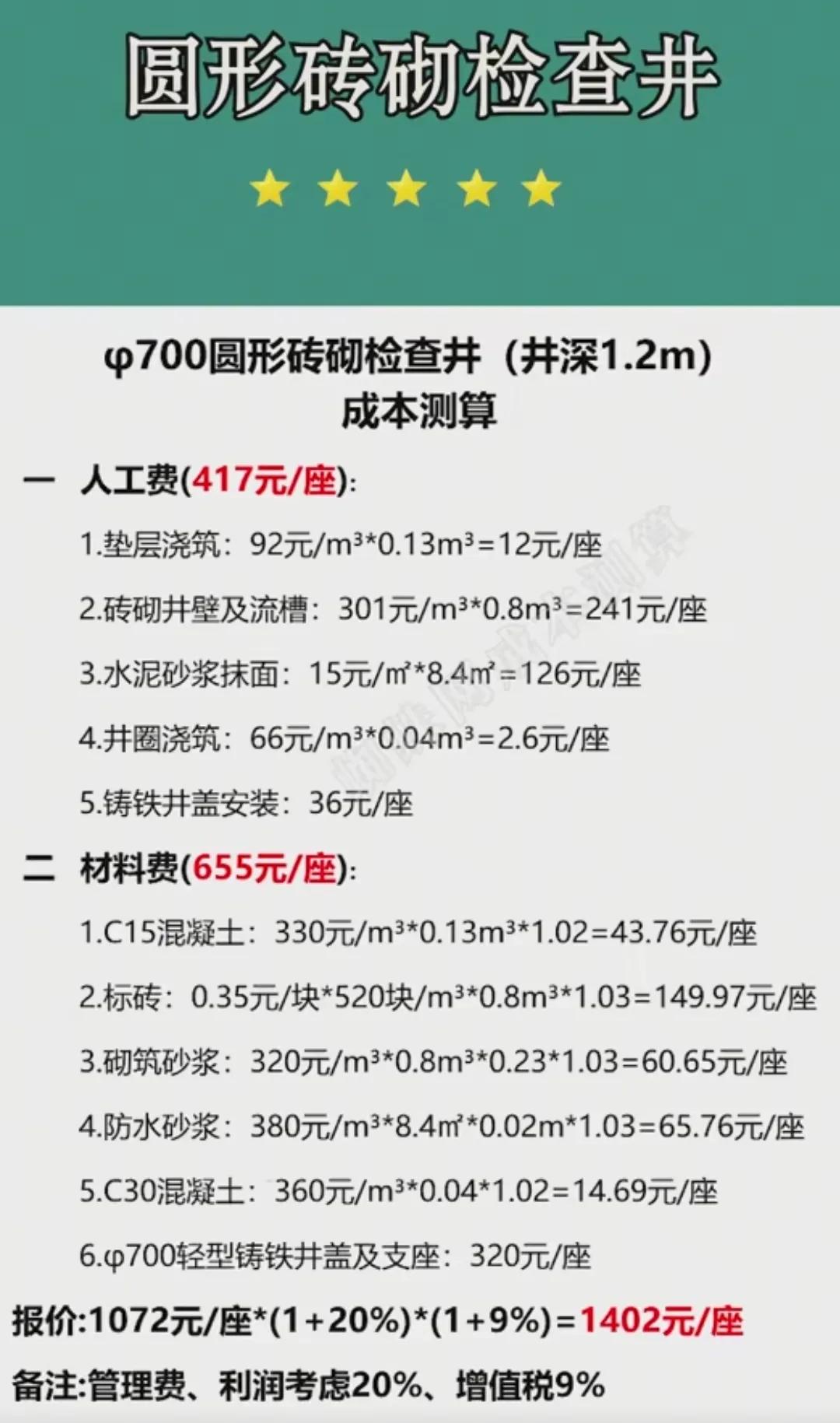 家人们,今天来给大家分享一个超实用的知识——p700圆形砖砌检查井(井深1.2m)的成本测算!快来看看你有没有被坑过😉 咱先说说人工费,一座井总共417元。这里面垫层浇筑12元,是92元/m³乘以0.13m³得来的。砖砌井壁及流槽花了241元,301元/m³乘以0.8m³。水泥砂浆抹面126元,15元/m²乘以8.4m²。井圈浇筑2.6元,66元/m³乘以0.04m³。还有铸铁井盖安装36元一座。 再看看材料费,一座要655元呢。C15混凝土43.76元,标砖149.97元,砌筑砂浆60.65元,防水砂浆65.76元,C30混凝土14.69元,p700轻型铸铁井盖及支座320元。 最后算下来,报价1402元一座,这里面管理费和利润算20%,还有9%的增值税。 我得跟大家说啊,在做这个检查井的时候,材料的质量可不能马虎,不然很容易出问题。还有,施工的工艺一定要规范,像水泥砂浆抹面要是没做好,就容易漏水。大家在做项目的时候,一定要把这些细节都盯紧了,可别到时候出了问题才后悔,那可就晚啦!圆形砖砌检查井