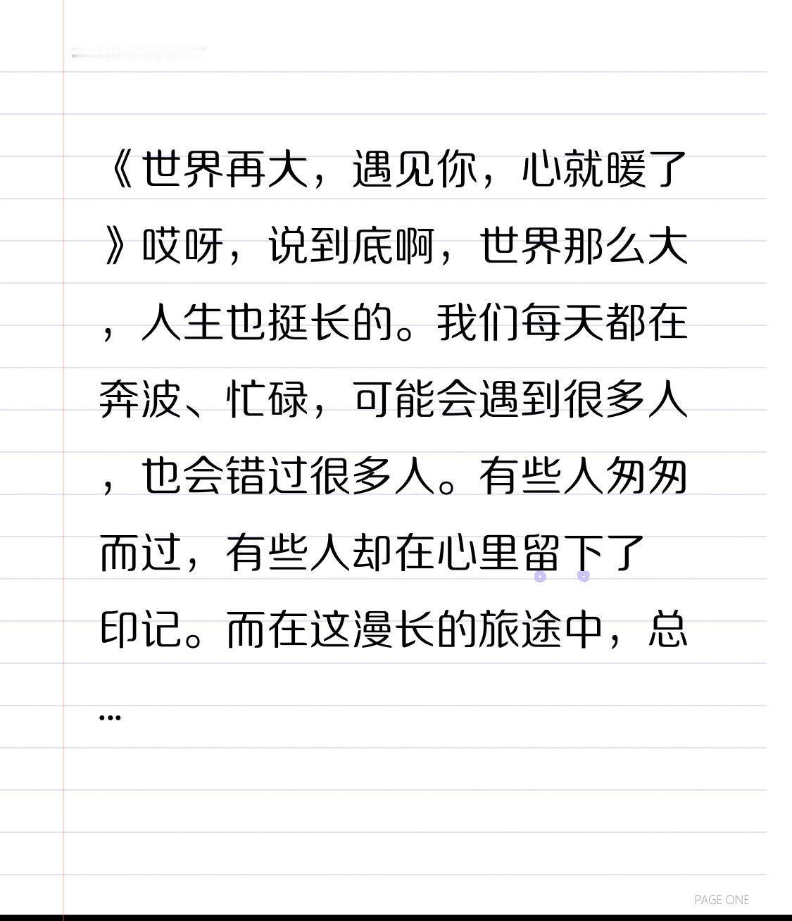《世界再大,遇见你,心就暖了》 哎呀,说到底啊,世界那么大,人生也挺长的。我们每天都在奔波、忙碌,可能会遇到很多人,也会错过很多人。有些人匆匆而过,有些人却在心里留下了印记。而在这漫长的旅途中,总会有那么一两个特别的人,就像心里的那束光,总能让你想要用温柔的方式去对待。 你知道的,就是那种不需要多说什么,只要一眼,就能感觉到彼此的心意。或许是那次不经意的相遇,或许是一次温暖的对话,让你觉得世界变得不那么孤单。遇到这样的人,真的是人生一大幸事。因为他们让你相信,世界再大,总会有那么一个人,让你愿意用最柔软的心去呵护。 其实啊,人生的意义,或许就是在不断的遇见和相知中找到那个让你想要温柔以待的人。无论未来怎样,记得珍惜那些让你心动、让你想用心去守护的人。毕竟,遇见你,心就暖了,这一辈子,也就值了。 你的世界是甜的 你的世界就甜了