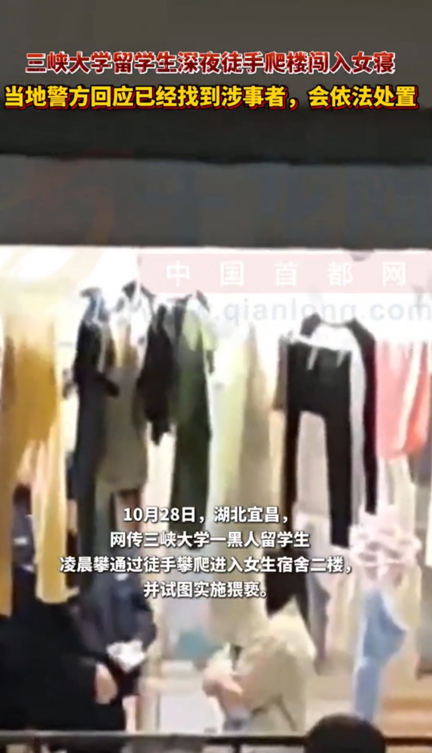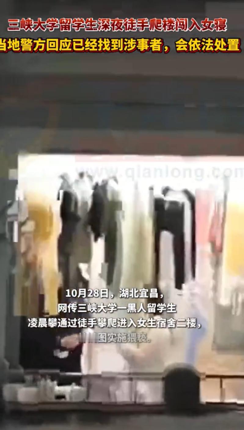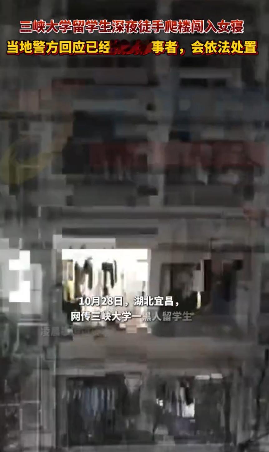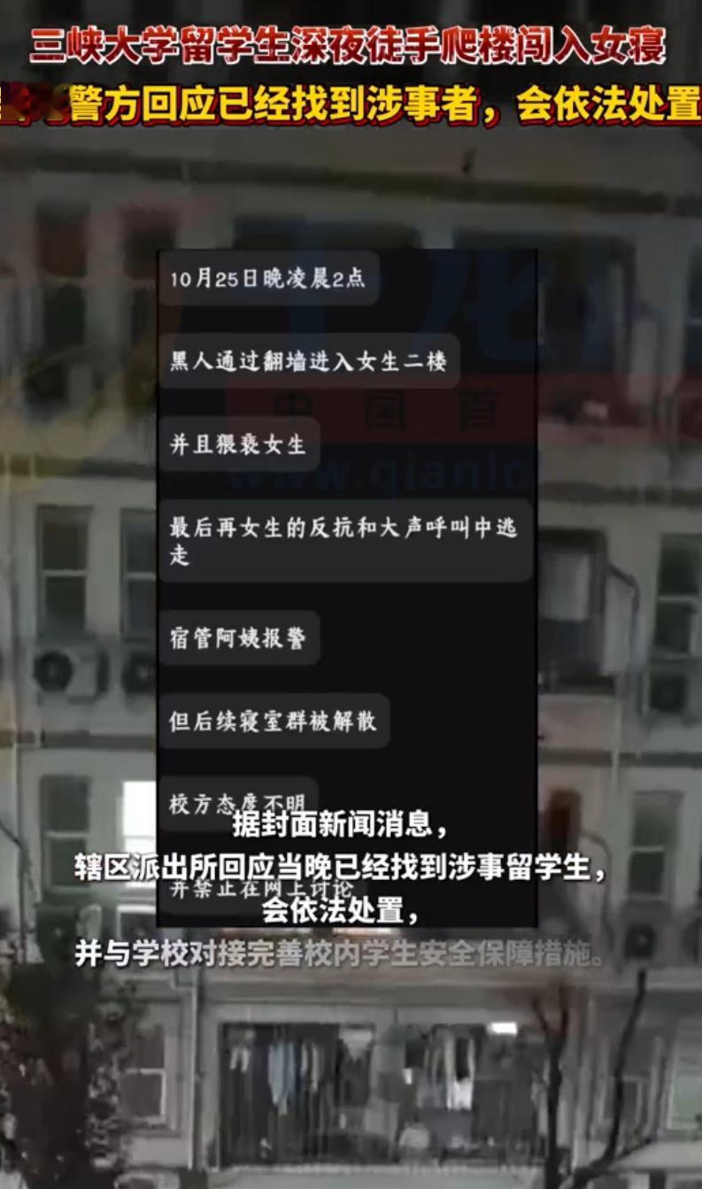 警方回应留学生深夜擅闯女寝2025年10月25日凌晨2点,三峡大学南苑女生宿舍突遭外籍留学生闯入——涉事者徒手攀爬防盗网翻入二楼寝室,试图猥亵一名女生,受害女生惊醒后搏斗致脸部受伤,呼救后对方逃离,宿管当即报警。