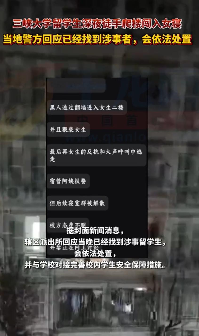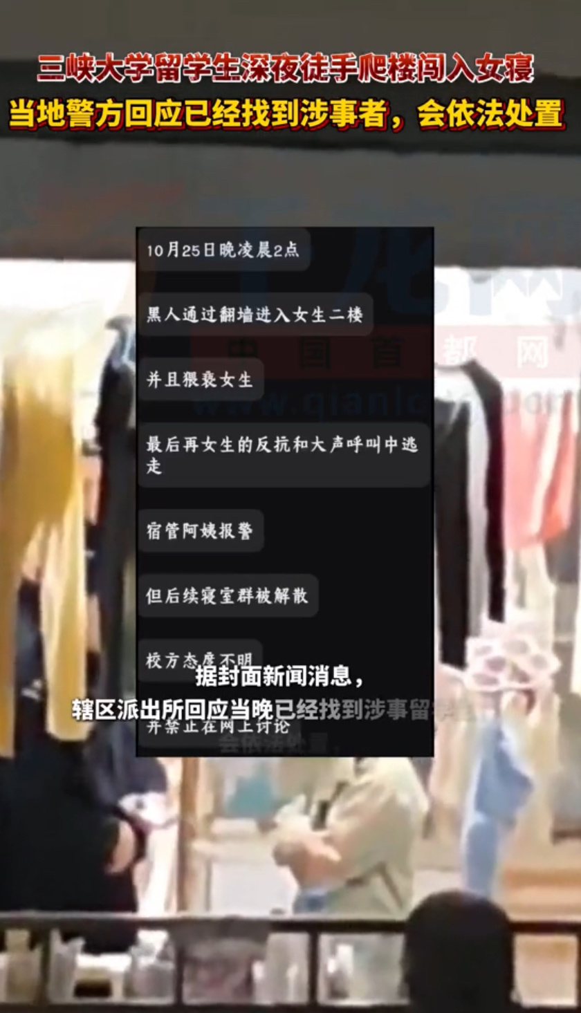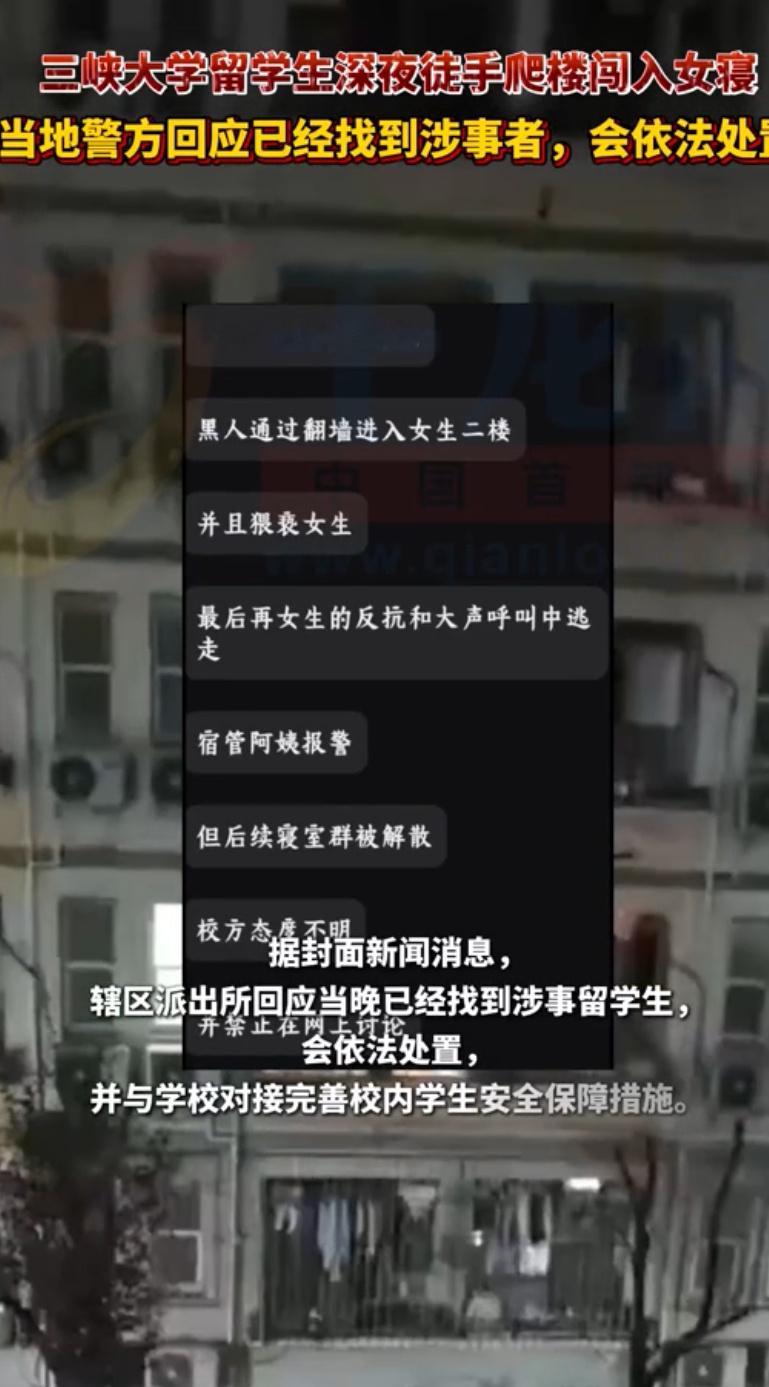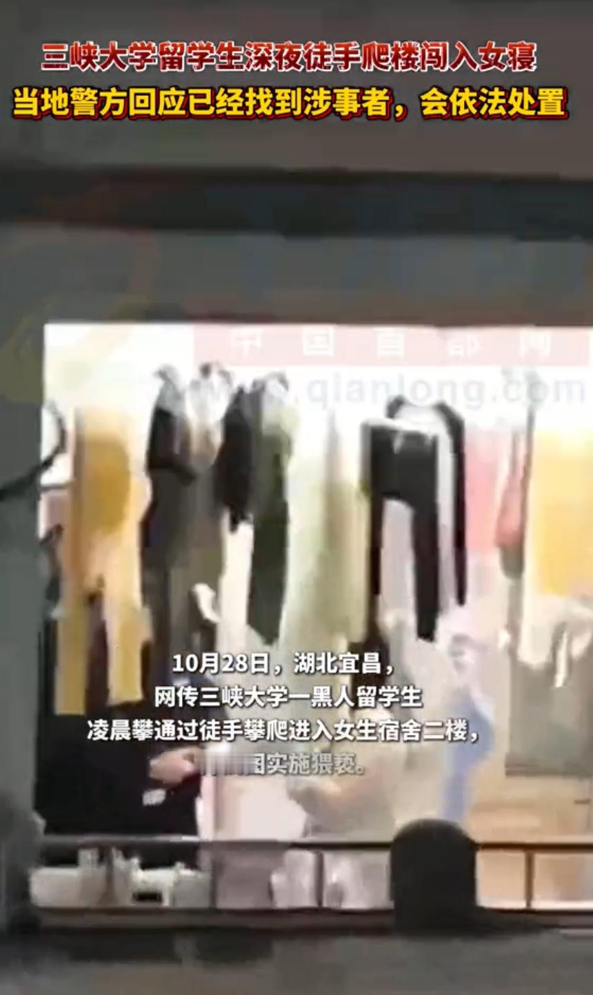 警方回应留学生深夜擅闯女寝2025年10月25日凌晨2点,三峡大学南苑女生宿舍突遭外籍留学生闯入——涉事者徒手攀爬防盗网翻入二楼寝室,试图猥亵一名女生,受害女生惊醒后搏斗致脸部受伤,呼救后对方逃离,宿管当即报警。