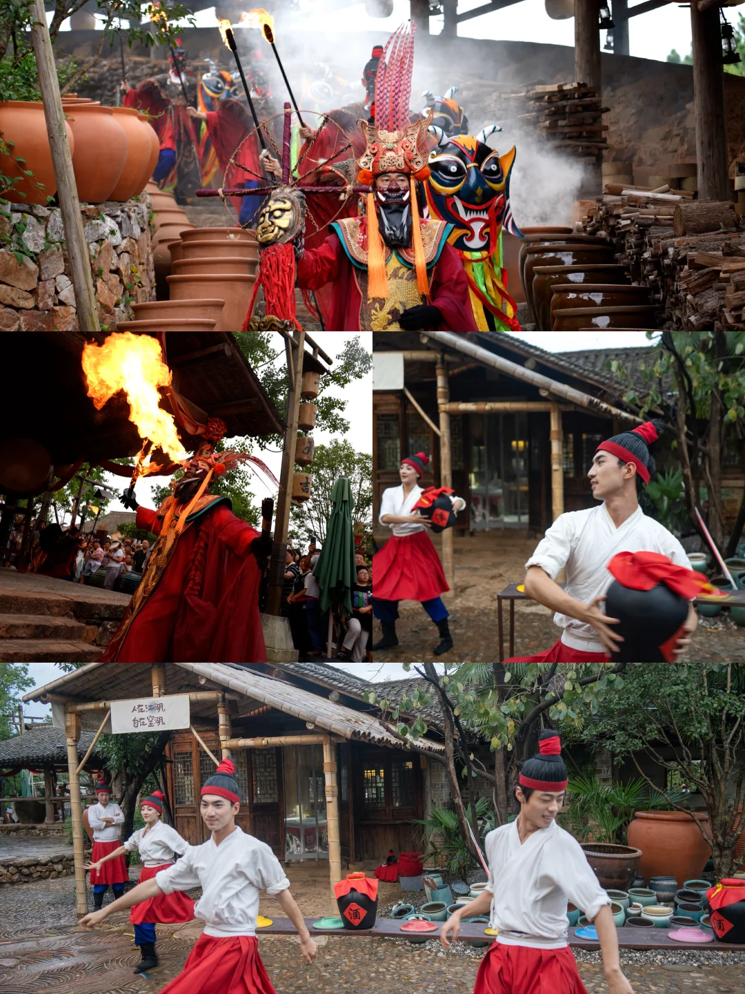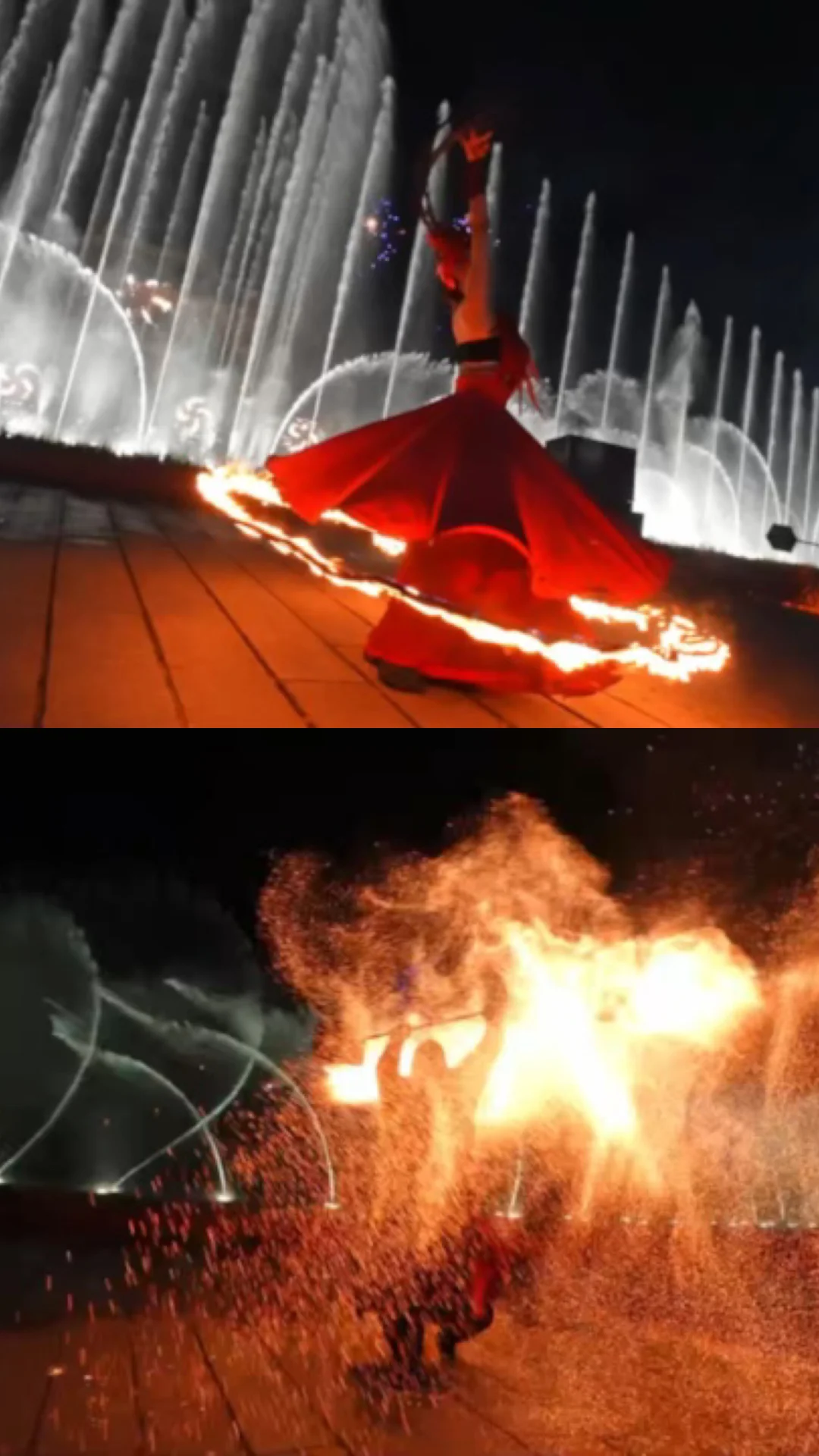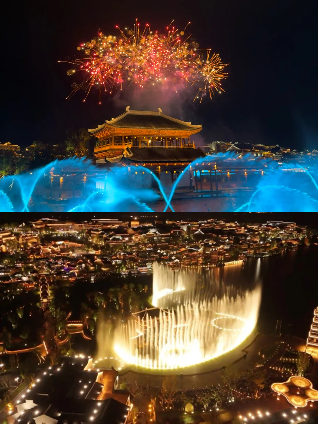 2️⃣ 龙腾水秀烟花:夜幕降临后,水秀、烟花与窑火演出交织成“天上宫阙”般的梦幻夜景,比白日更添浪漫,水火共舞的视觉震撼直击人心。