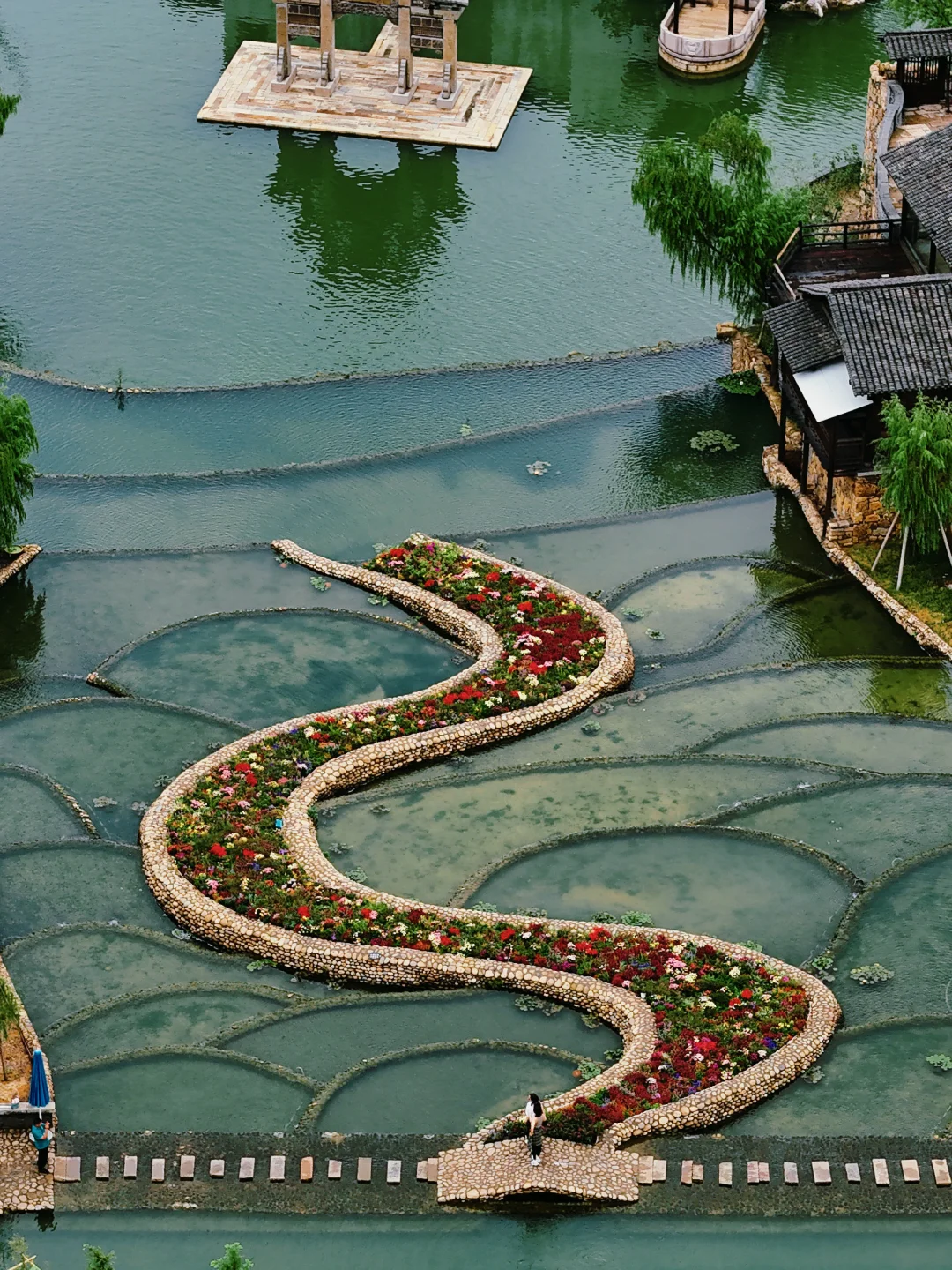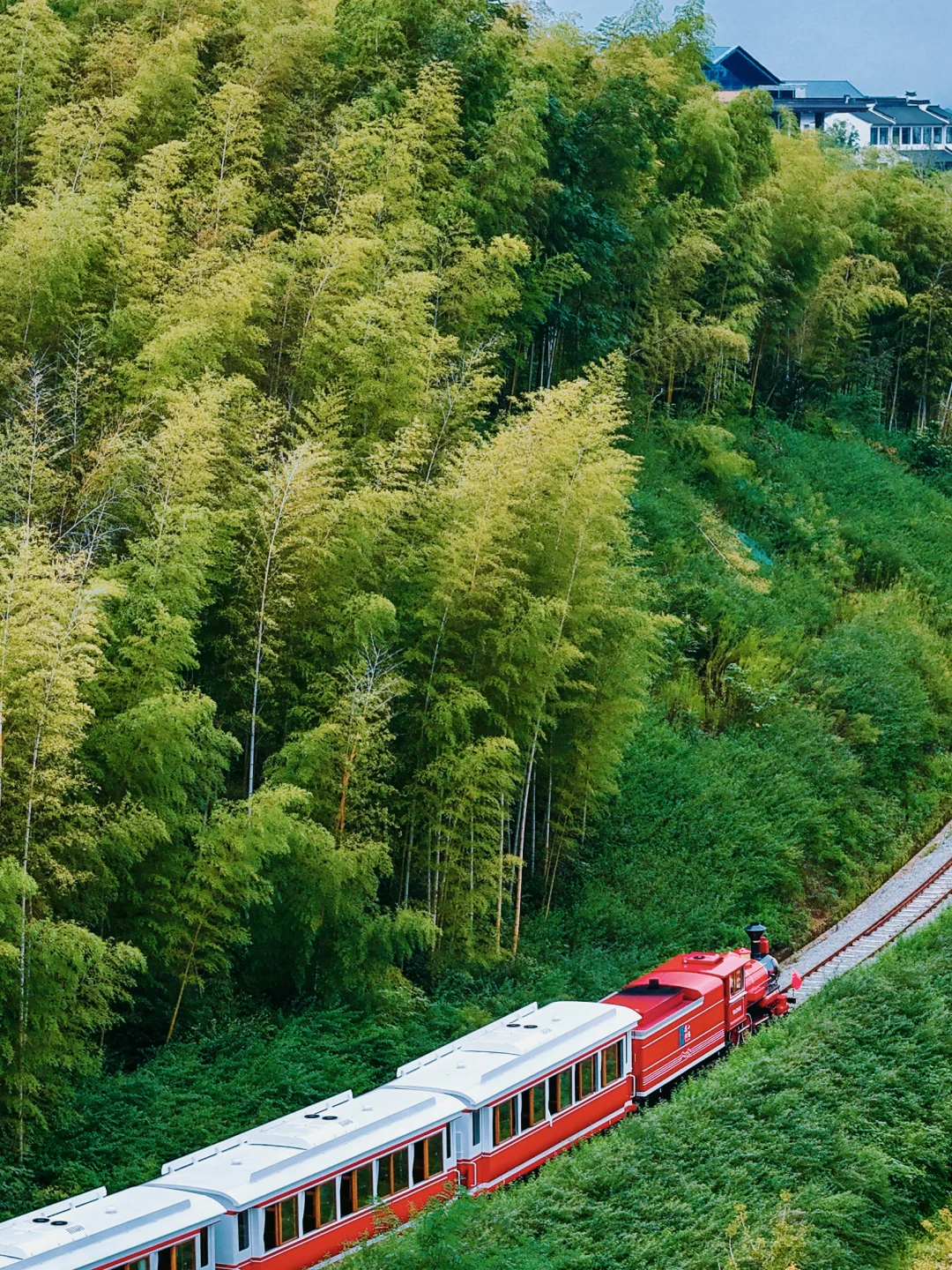 1️⃣ 云上的小火车:红白色车厢穿梭于湖泊、竹林与茶田之间,仿佛驶入江南画卷,随手一拍皆是慵懒治愈感。