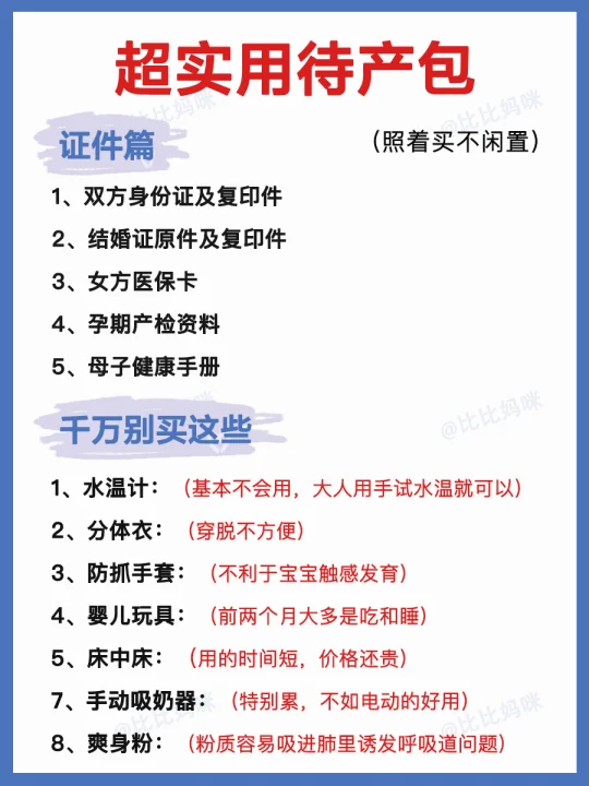 秋冬预产期的姐妹们,别再跟风瞎买一通啦~ 生完你会发现很多东西真的用不到 纯属浪费💰,还闲置占地方 收好这份超实用的待产包清单 按需购买,还能省下一大笔💰,不做大怨种