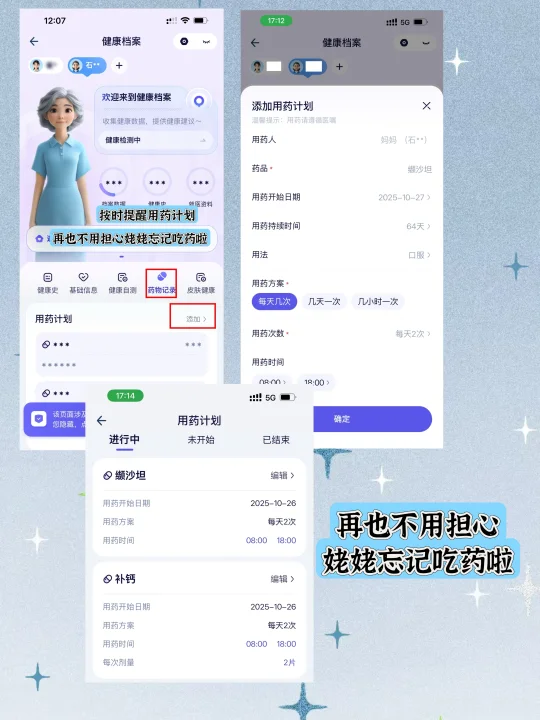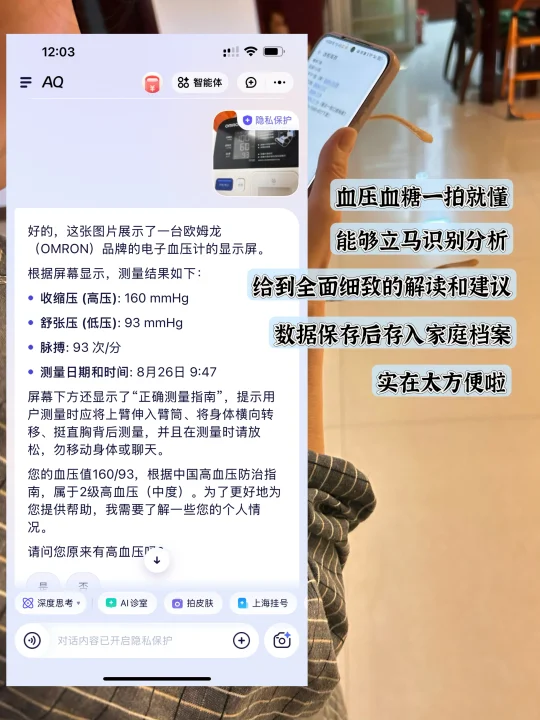 我(汗):duck不必,现在AI这么发达,帮我姥安排AQ就可以!⾎糖⾎压⼀拍就懂,还能多轮追问,不比咱们自己观察强多了。还有慢病用药联合提醒的功能,设置好时间和剂量,到点准时提醒我姥吃药。绑定家庭健康档案后,每天的血压血糖、用药情况都会同步发给你,要多省心有多省心