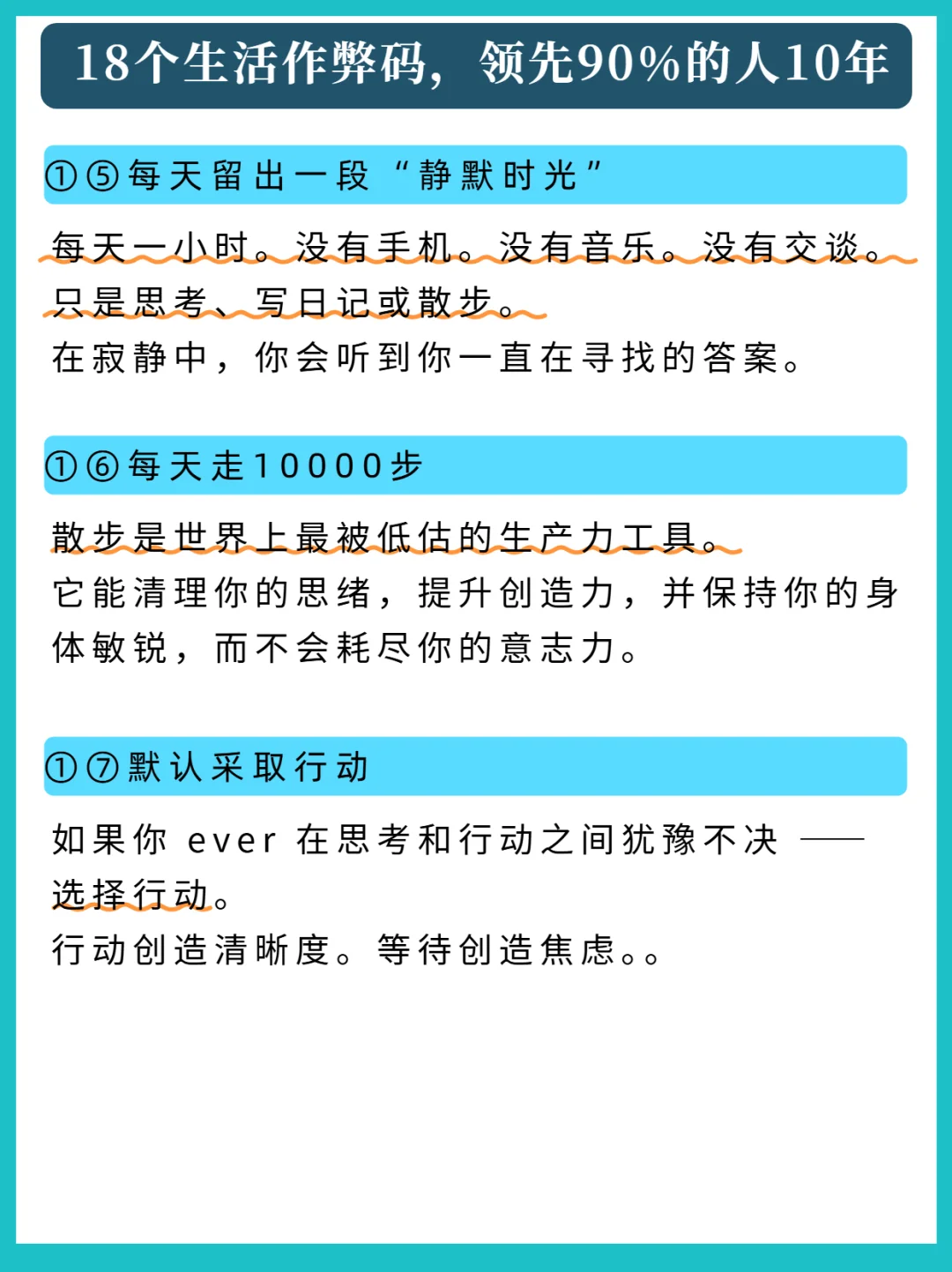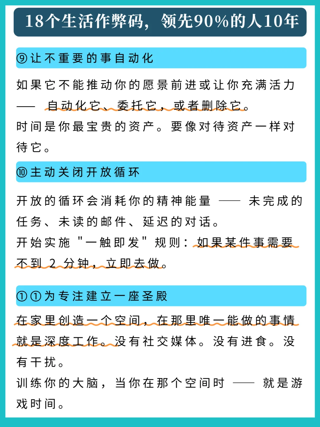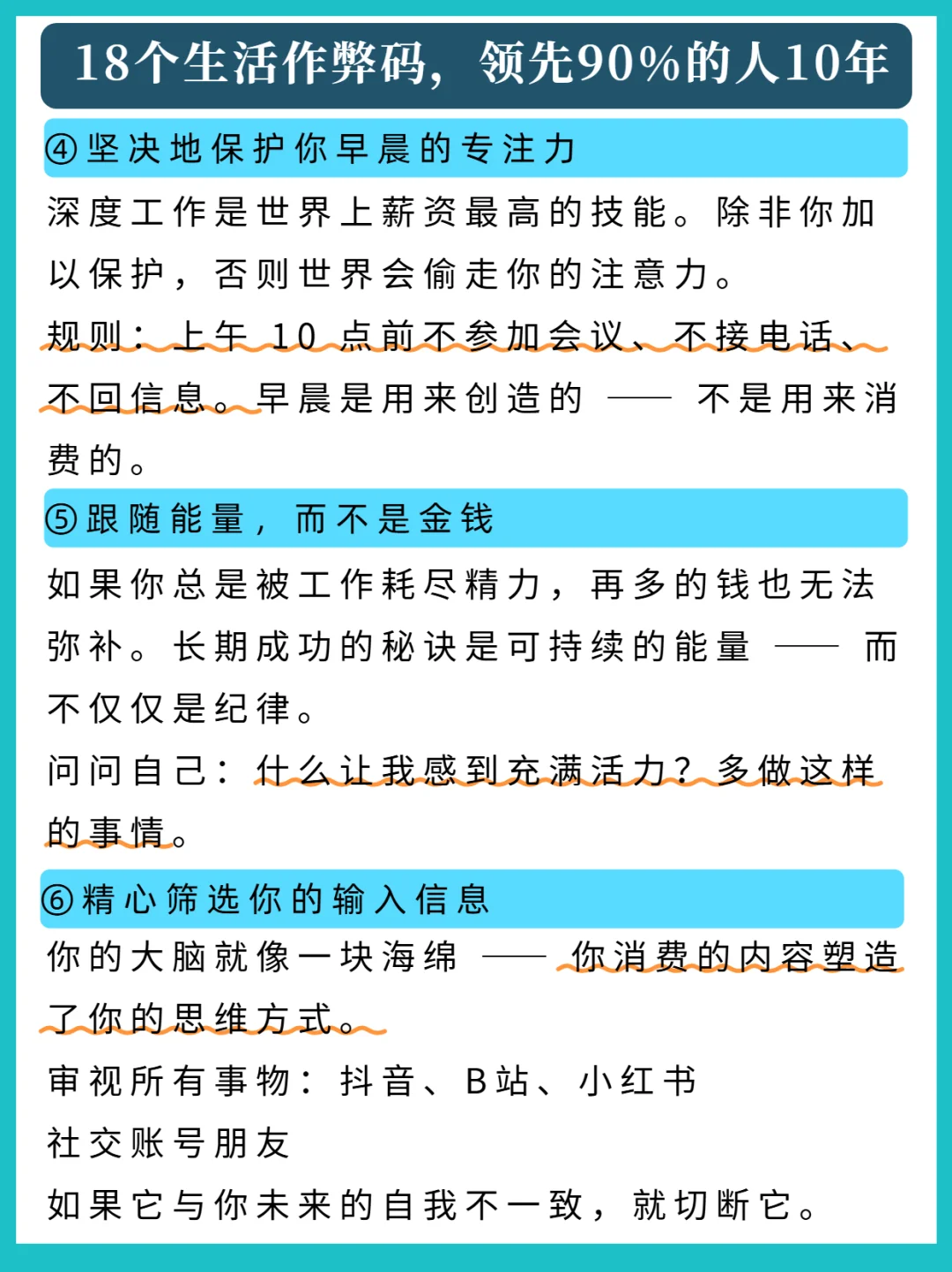 深度工作是最值钱的技能。上午 10 点前不开会 / 回消息 / 接电话,晨间只用来 “创造” 而非 “消耗”。