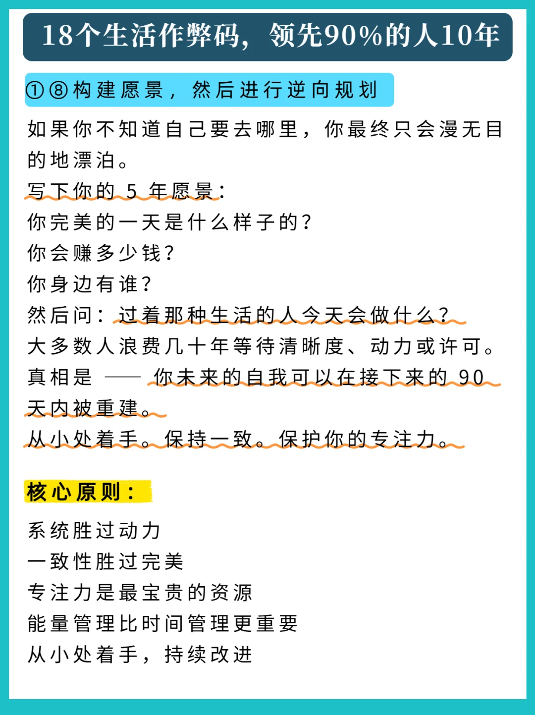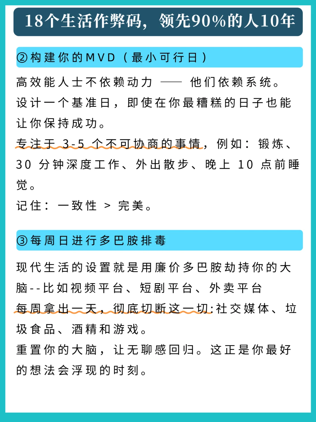 高效人士靠系统而非动力。设计基准日,聚焦 3-5 个 “没得商量” 的事(如锻炼、30 分钟深度工作、10 点前睡),一致性>完美。