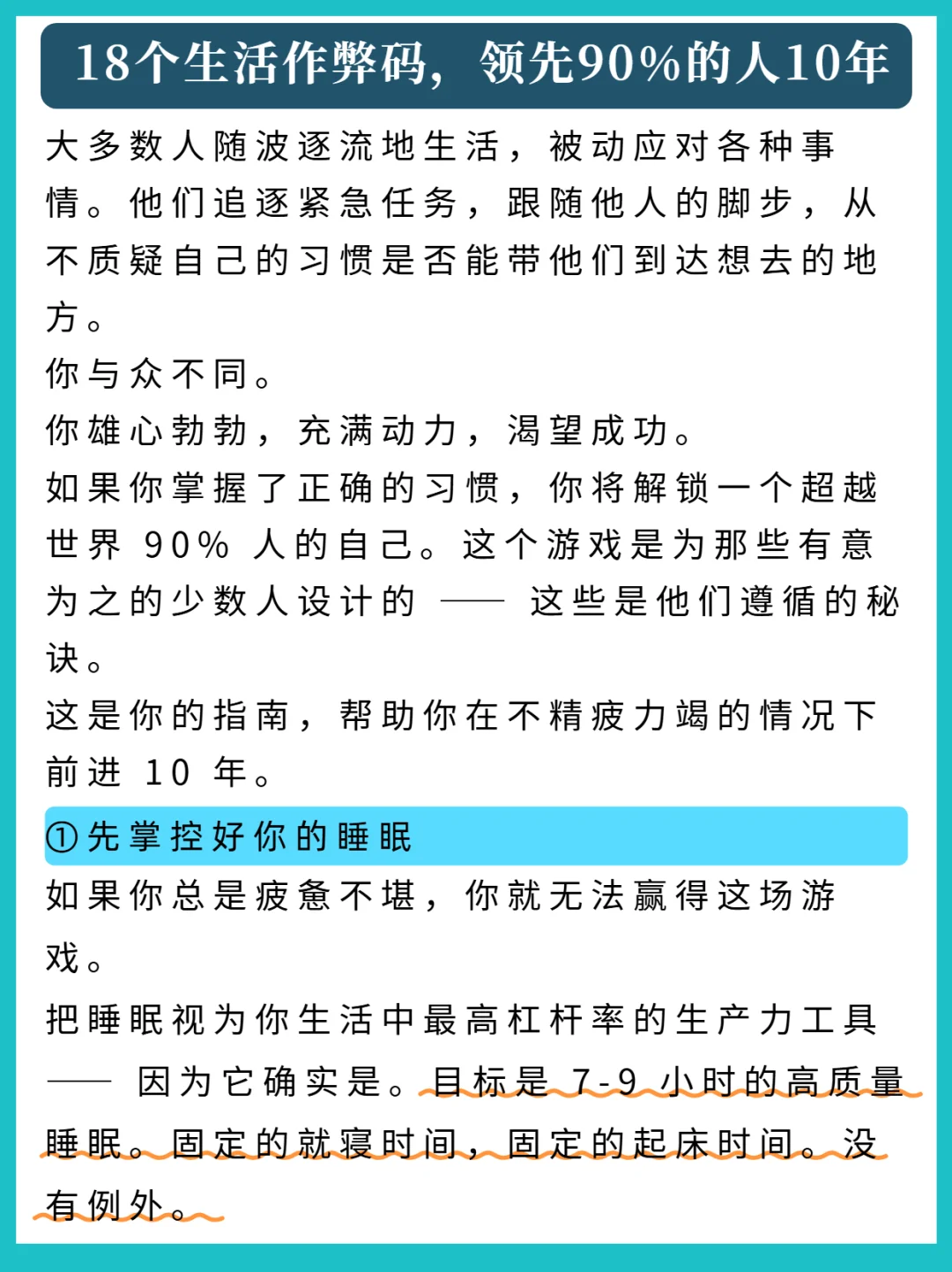 把睡眠当最高杠杆的生产力工具,目标 7-9 小时高质量睡眠,固定就寝 & 起床时间,无例外。