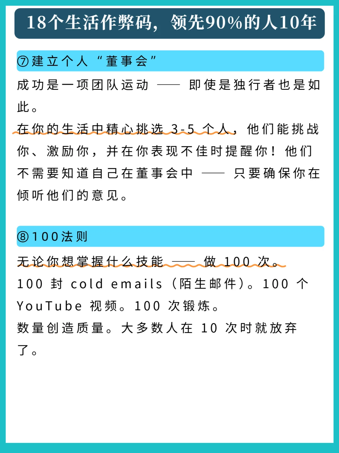 练技能就做 100 次(100 封冷邮件、100 个视频、100 次锻炼)。量变生质变,多数人在第 10 次就放弃了。