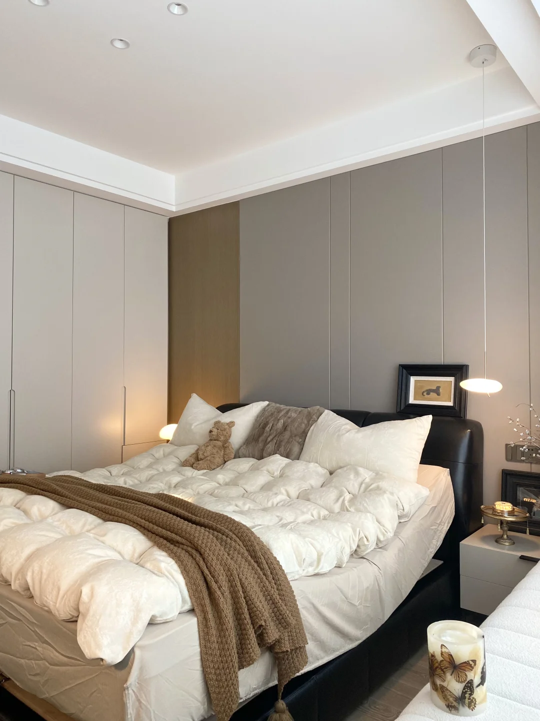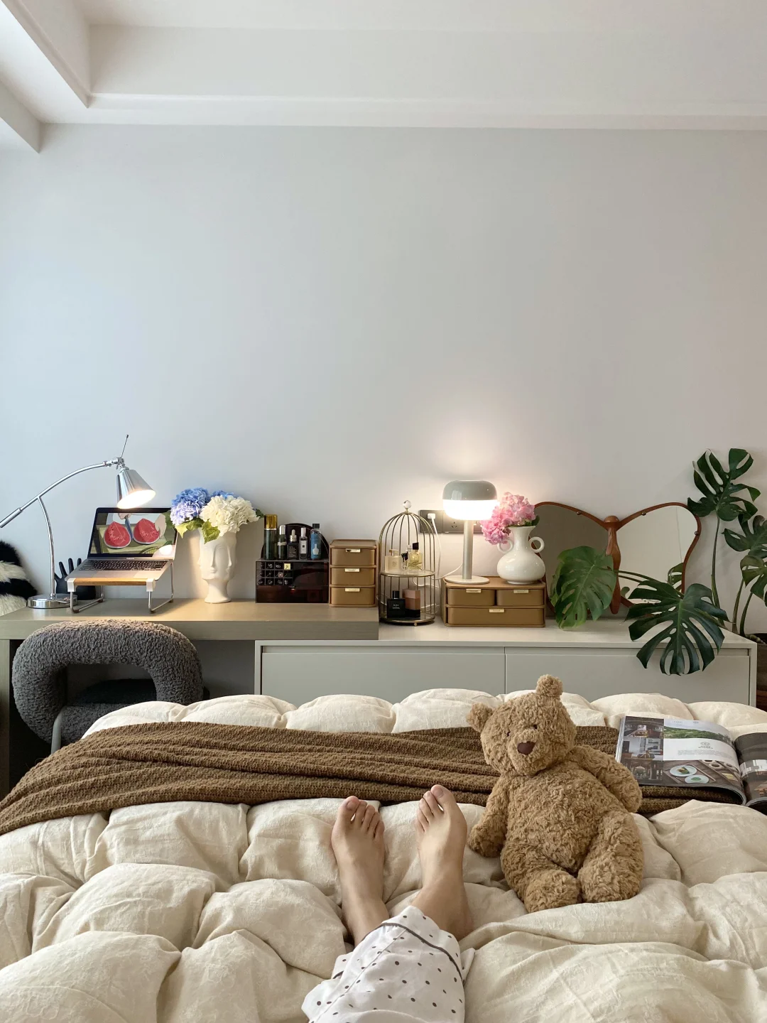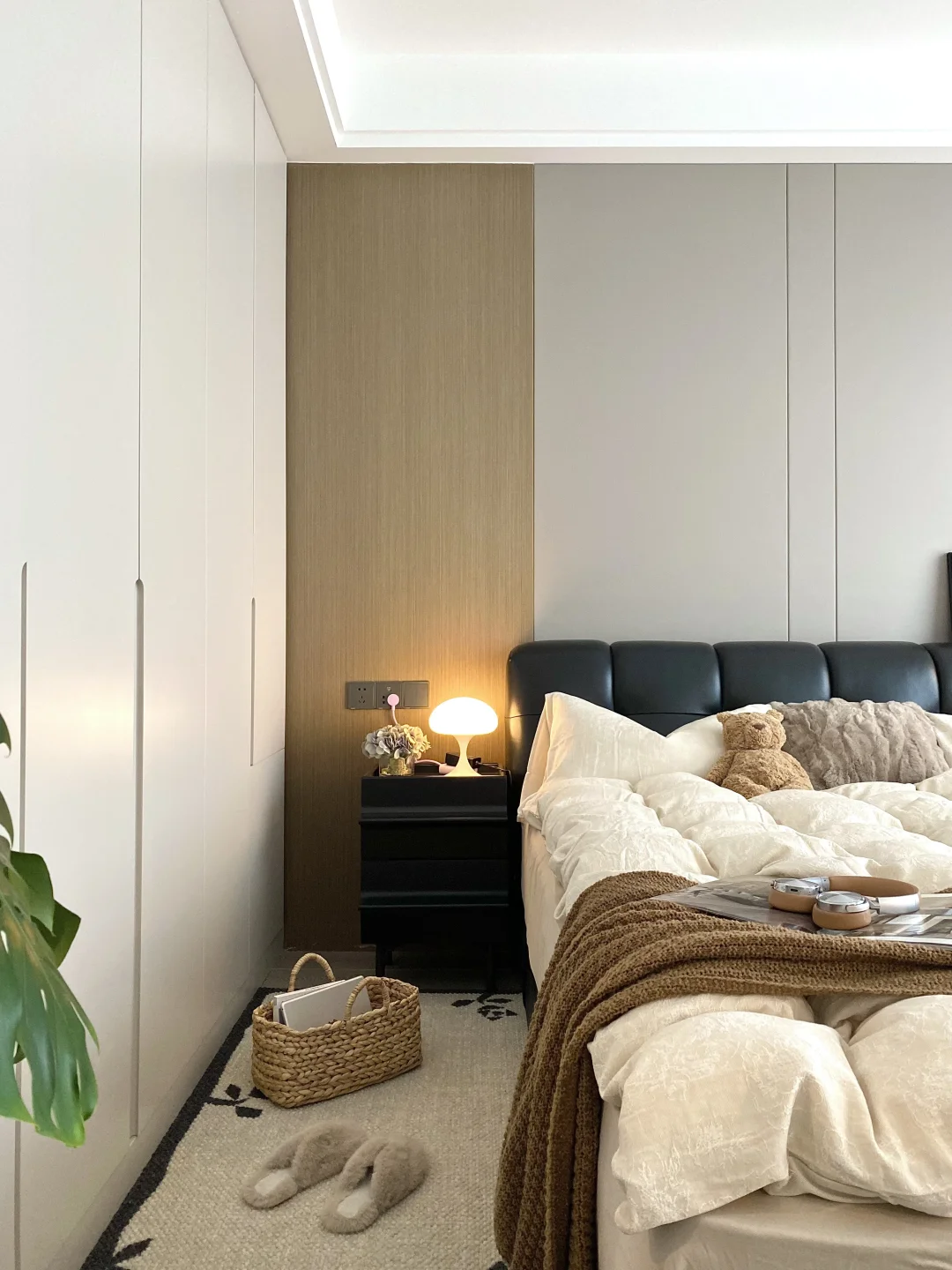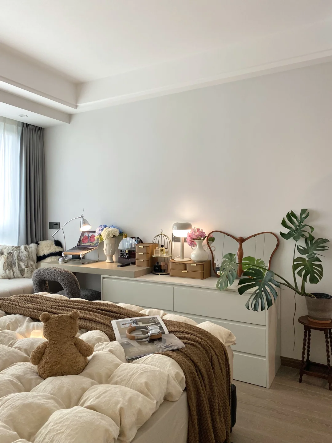 床尾的斗柜+梳妆台二合一超省空间,飘窗台铺着软fufu的垫子,还有一门到顶的衣柜把杂物全藏起,完全长在我的审美点上
