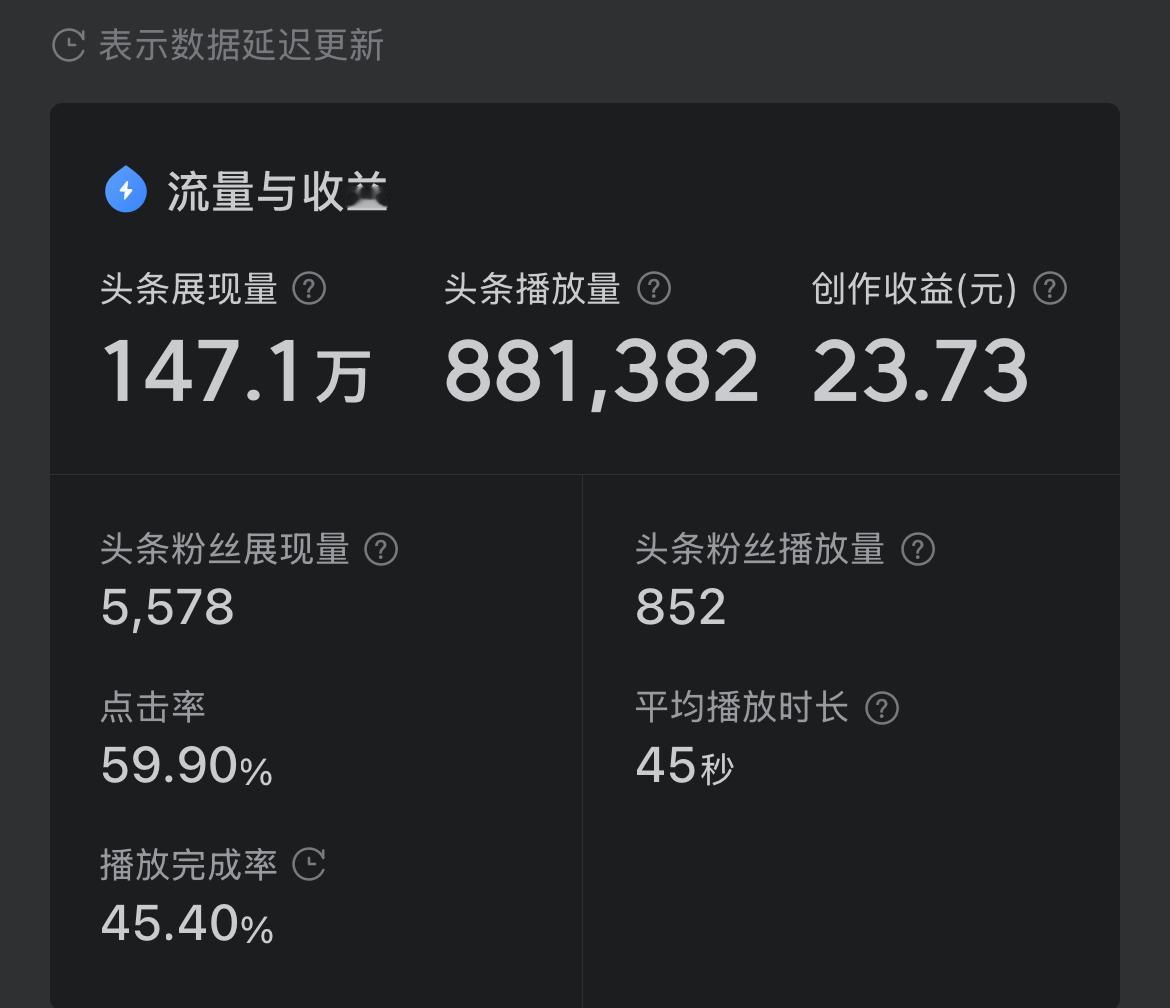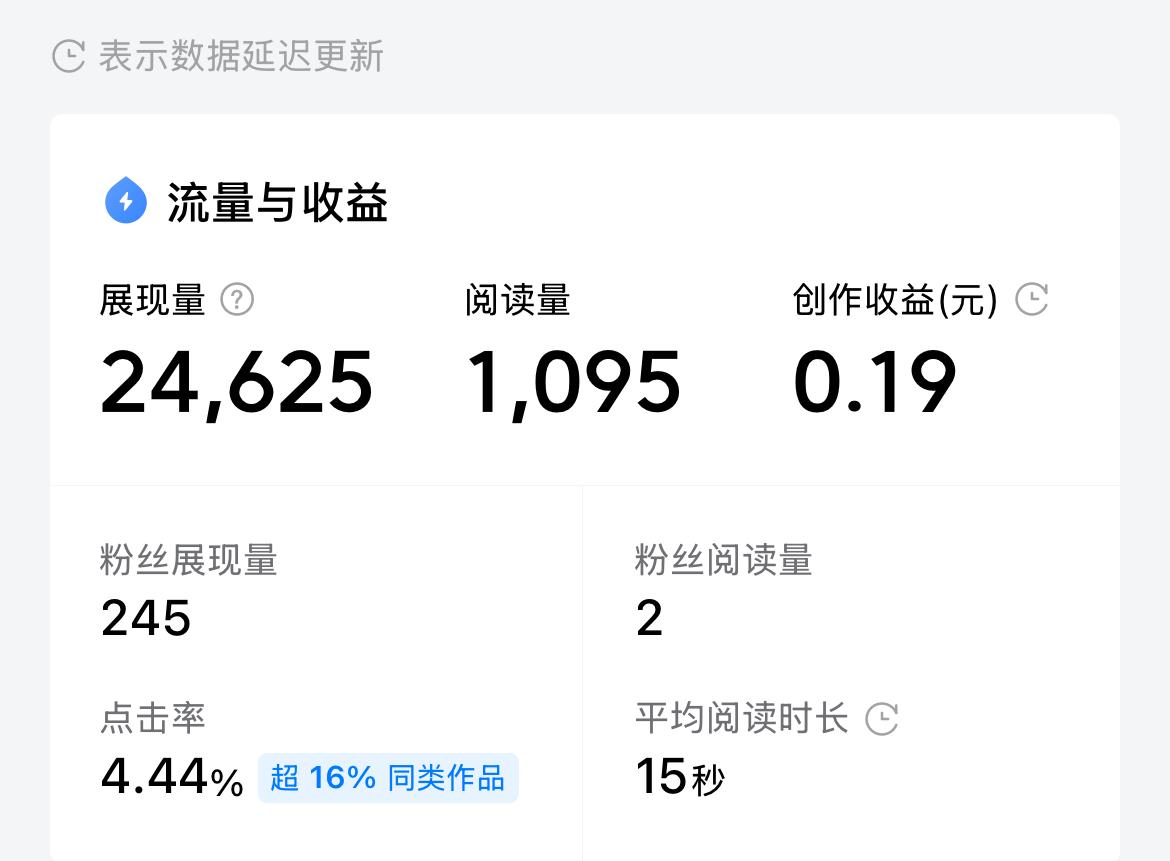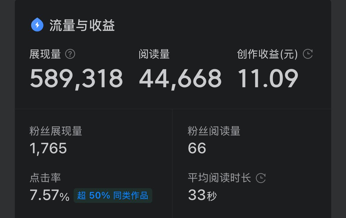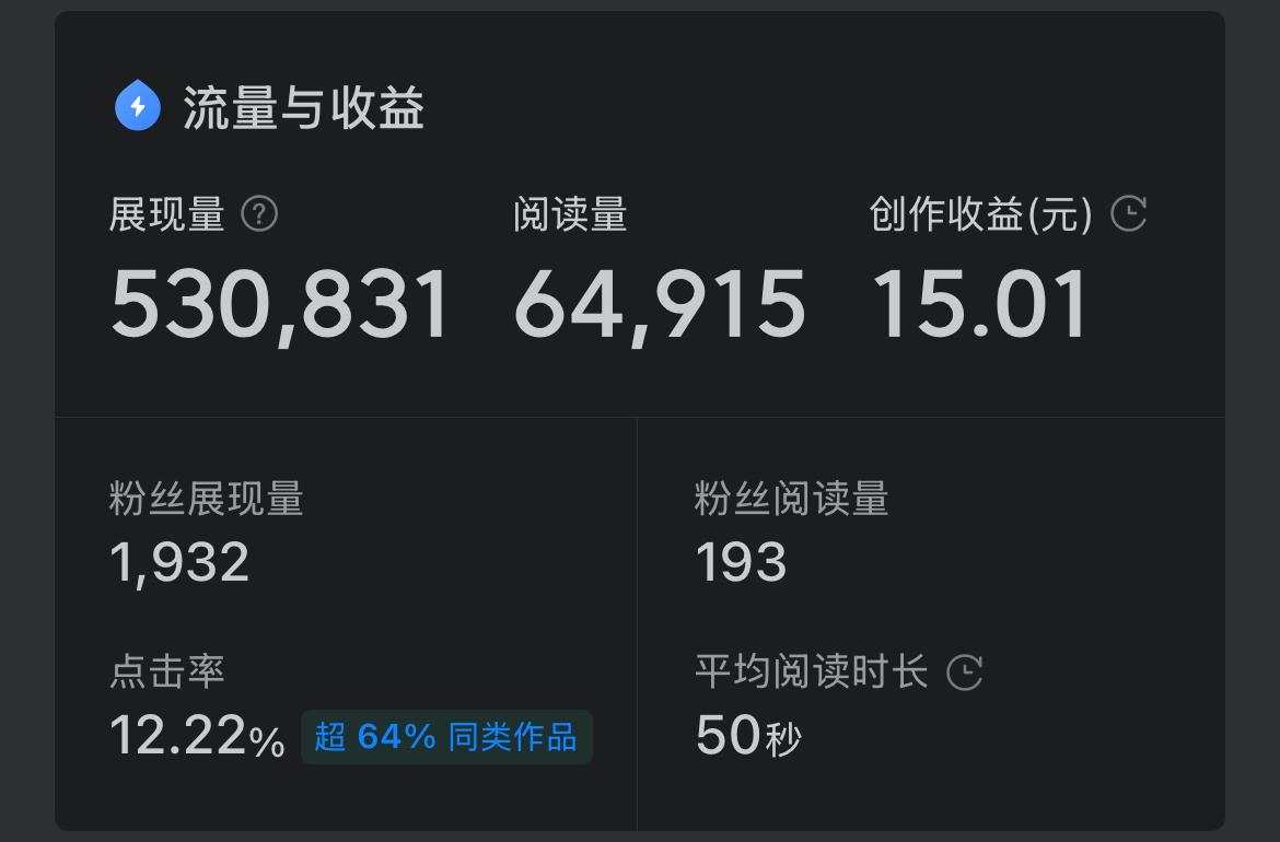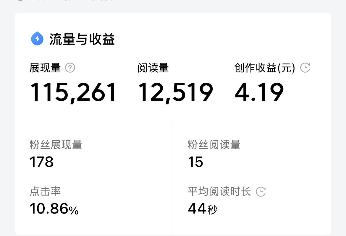 头条现在越来越“钝刀割肉只嫌痛的轻?” 经过发文和以前的收益对比,发现以前阅读量三万多就收益几十元,一万多的阅读量甚至才几元不到。 现在他们是吃肉连骨头也不吐了,而且现在大家基本都是发的百字以上的文章,特别是加入“头条新锐创作者”后更糟。几万的阅读量才十几元收益,甚至更低,辛苦的劳动如此微薄,动力已经开始下降啦! 我随便找了几篇近段的文章收益发出来大家共同参考参考,不知道条友们是啥情况?