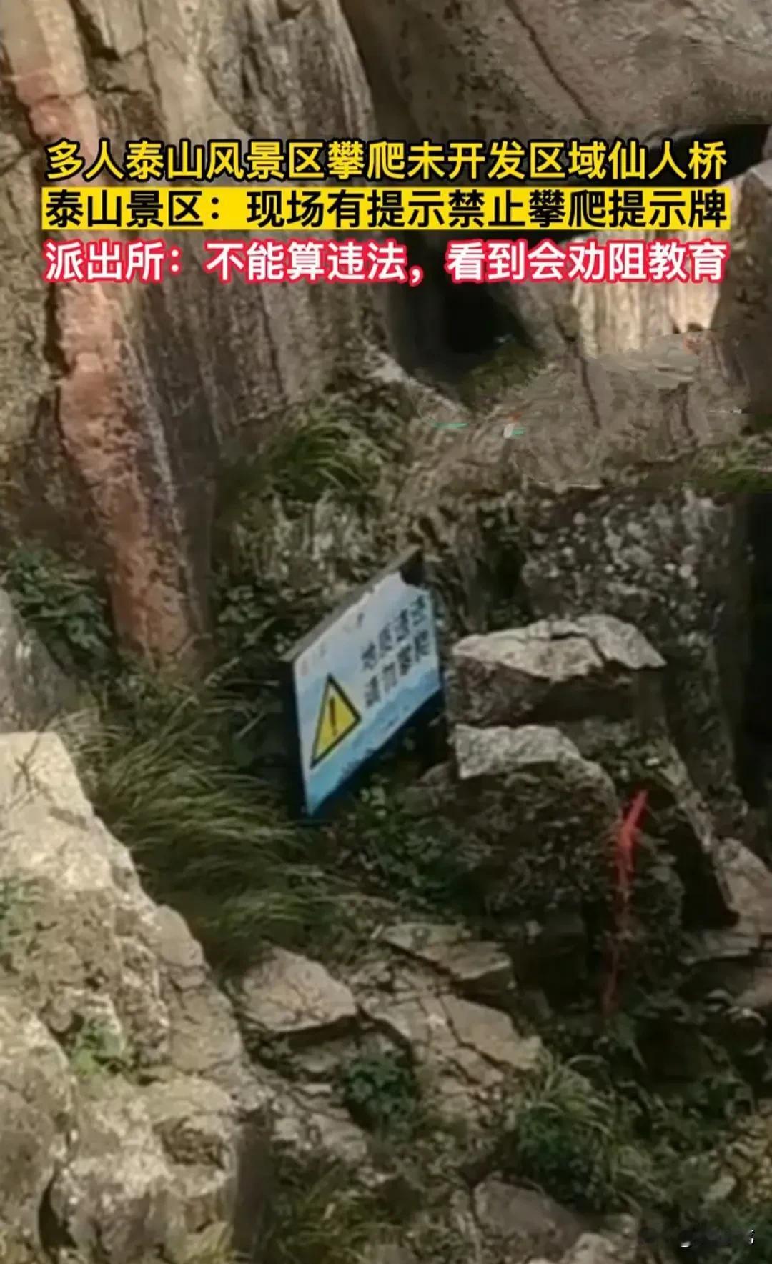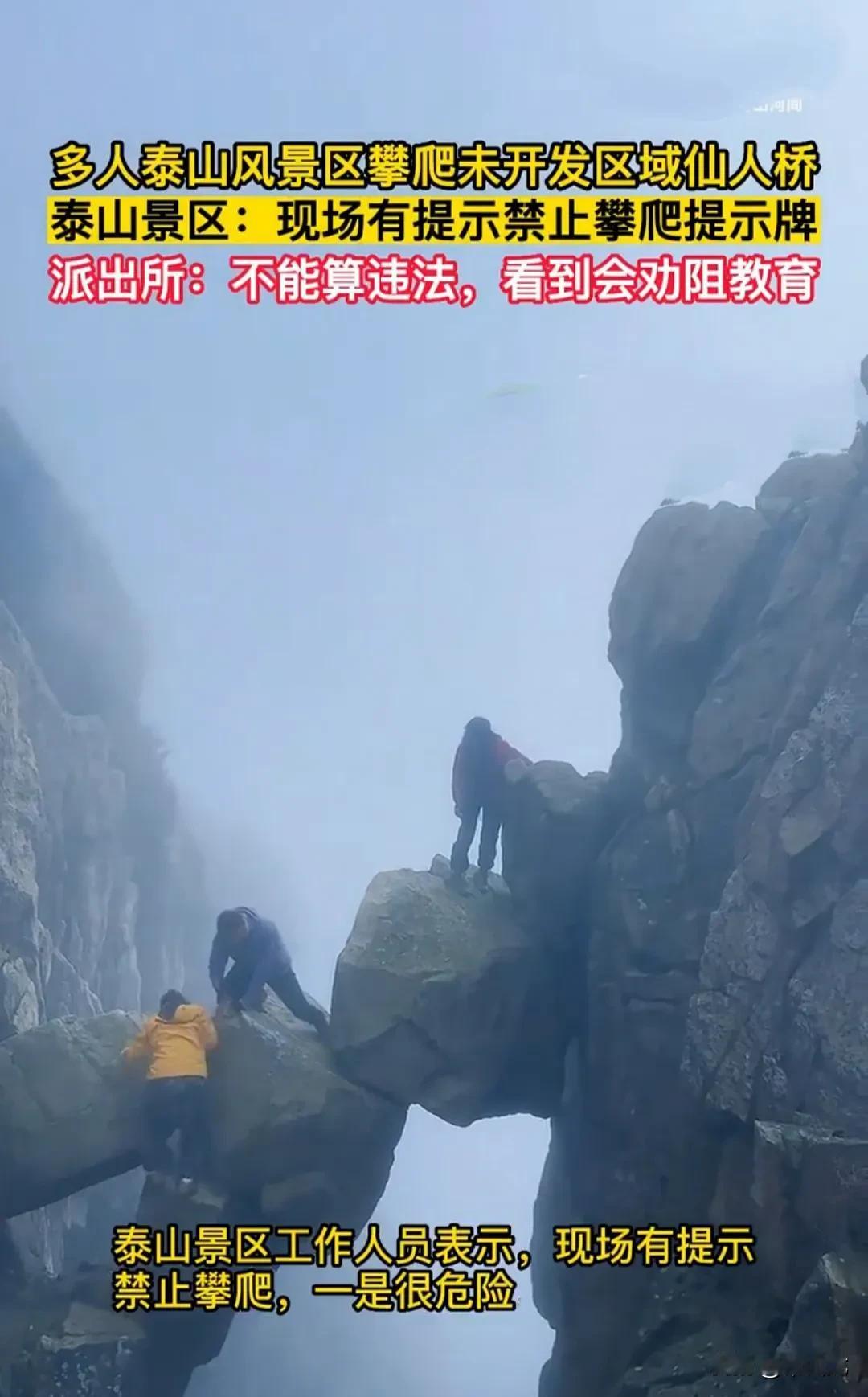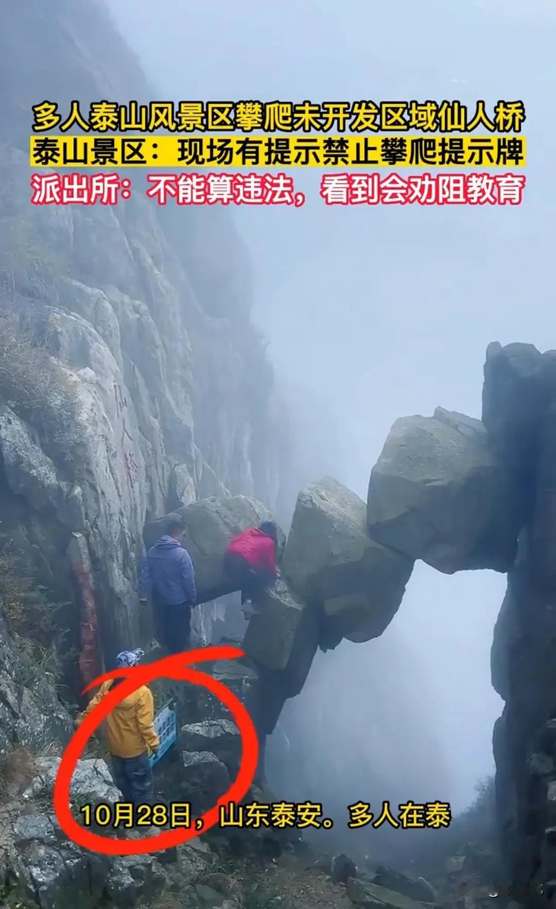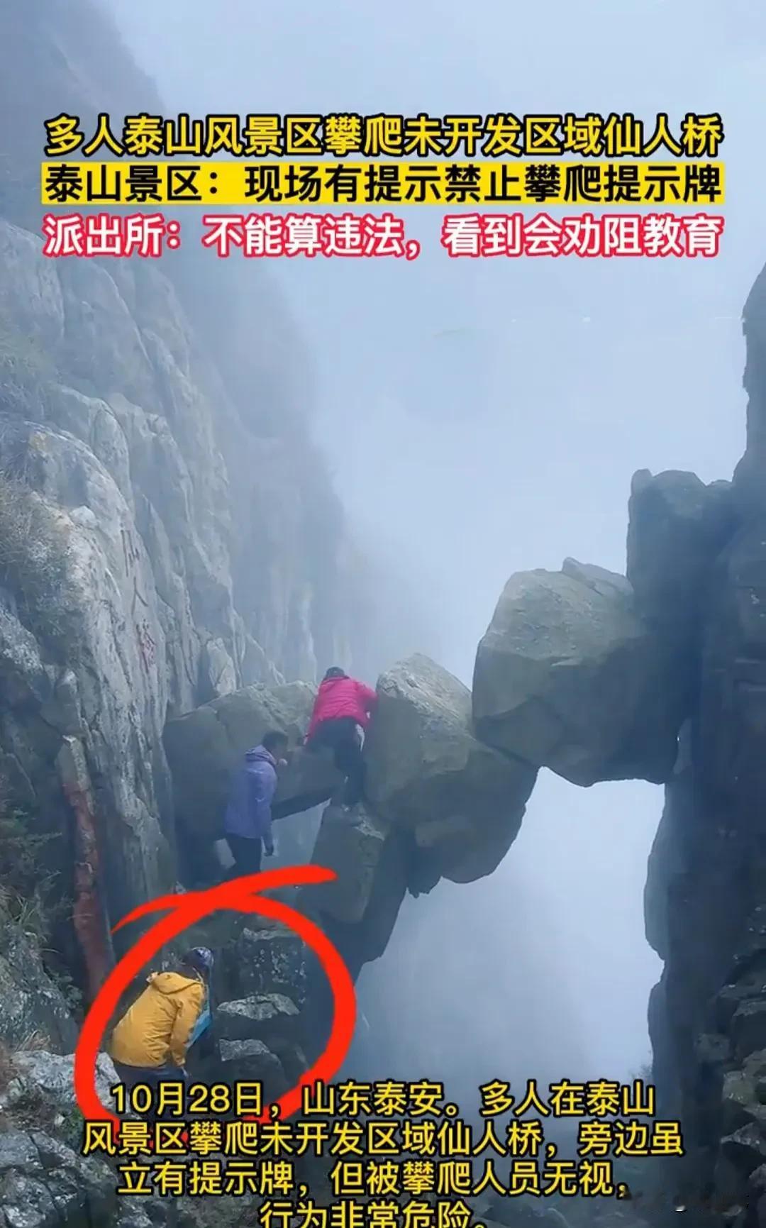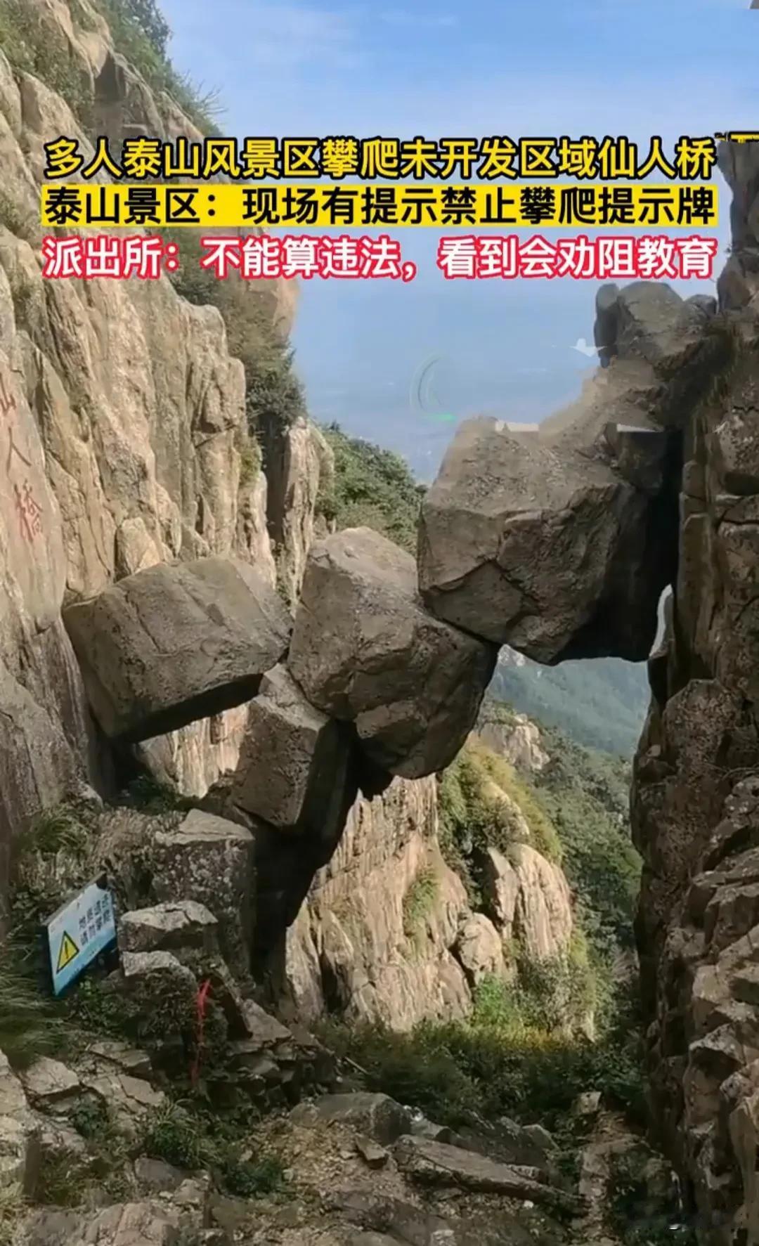 10月28日,有游客发视频说在泰山风景区岱定区域,三名游客私自攀爬仙人桥巨石,该仙人桥有三块天然形成的巨石相互抵撑构成,横架于两座峭壁之间,下方就是万丈深渊,因为地势险要,仙人桥并未对游客开放。 视频中,在仙人桥巨石下方,赫然立着一块警示牌,上面醒目地写着:“地质疏松,请勿攀爬。” 对于如此醒目的警示,三名游客完全无视,他们就从警示牌上方跨了过去。 最先上去的还是一名穿红色冲锋衣的女士,另外两名男士依次跟在后方,三人彼此援手,相互托举,总算有惊无险地爬过了仙人桥。 看到这段视频,真为他们捏了一把汗,这种天然形成的石桥,因为长期受风沙侵蚀,巨石结构松散脆弱,外力振动极易引起失衡坍塌。 一旦巨石坍塌或不慎失足坠落,绝无生还的可能。 这种行为就像在刀尖上跳舞,不仅会危害自身安全,还会破坏千万年形成的自然遗迹。 如果发生意外,家属肯定要来讹景区,景区虽然立了警示牌,但他们肯定会说,为什么不派专人守着? 有道是,良言难劝该死的鬼,景区已经立了警示牌,说明了风险,你偏偏无视警告,非要爬过去,明显就是自己作死。 都是成年人了,要为自己的选择承担后果,发生意外也是咎由自取。 对于这些无视安全警告,执意要挑战规则的人,景区应通过人脸识别技术追溯他们的身份,将他们纳入旅游黑名单,终身禁止进入星级以上风景区。