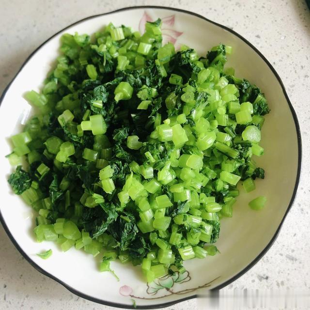 3:紧接着,我们将焯烫后的雪里红及时捞出来,然后挤去多余水分,后切成细碎状。与此同时,新鲜的猪肉,我们也可以剁碎成末,并加入少许盐、生抽、料酒、一起抓匀腌制10分钟。