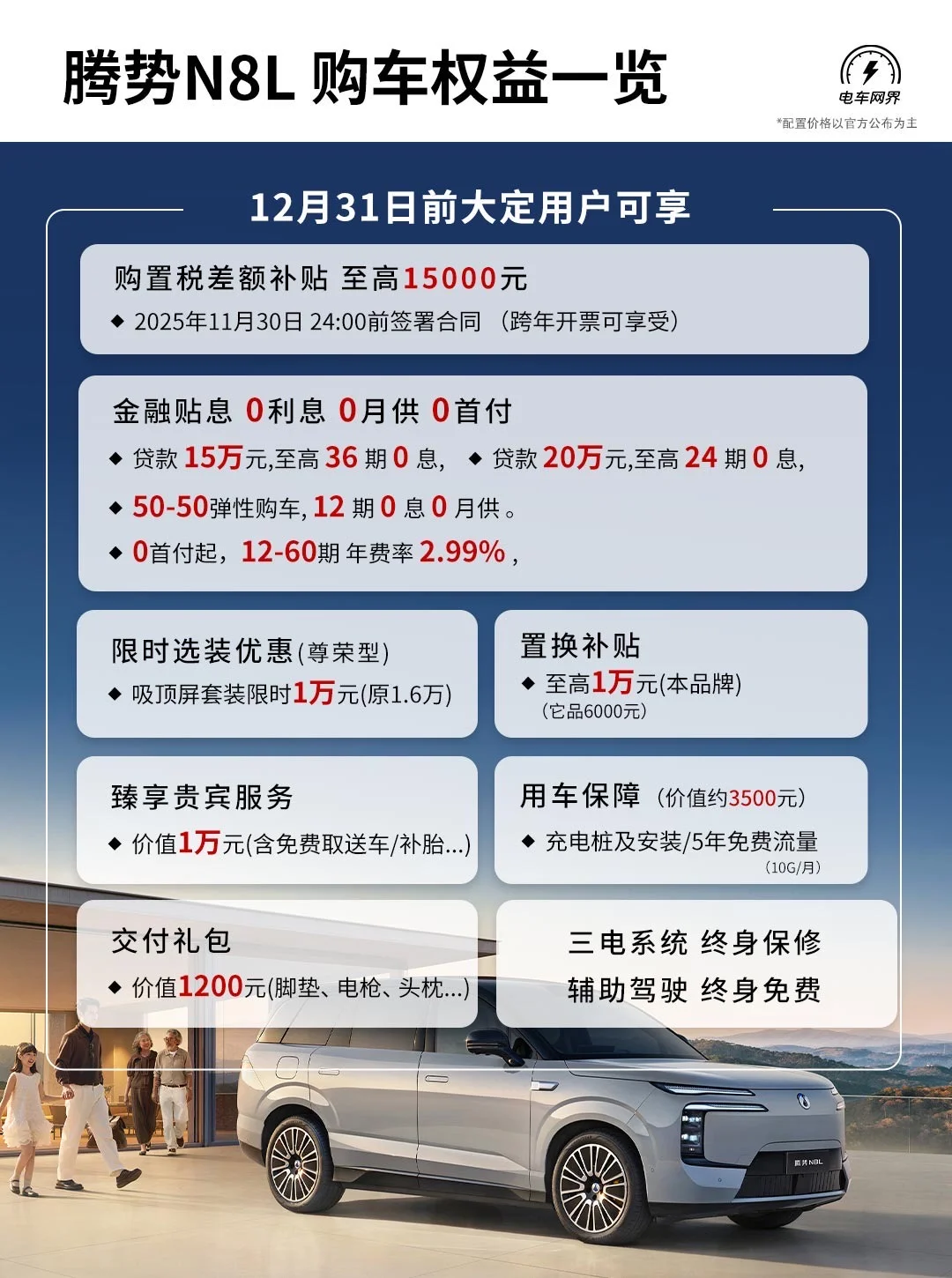 喜欢腾势N8L的建议先看看这张配置图,以及上市权益图,其实入门版就能满足你的用车需求。