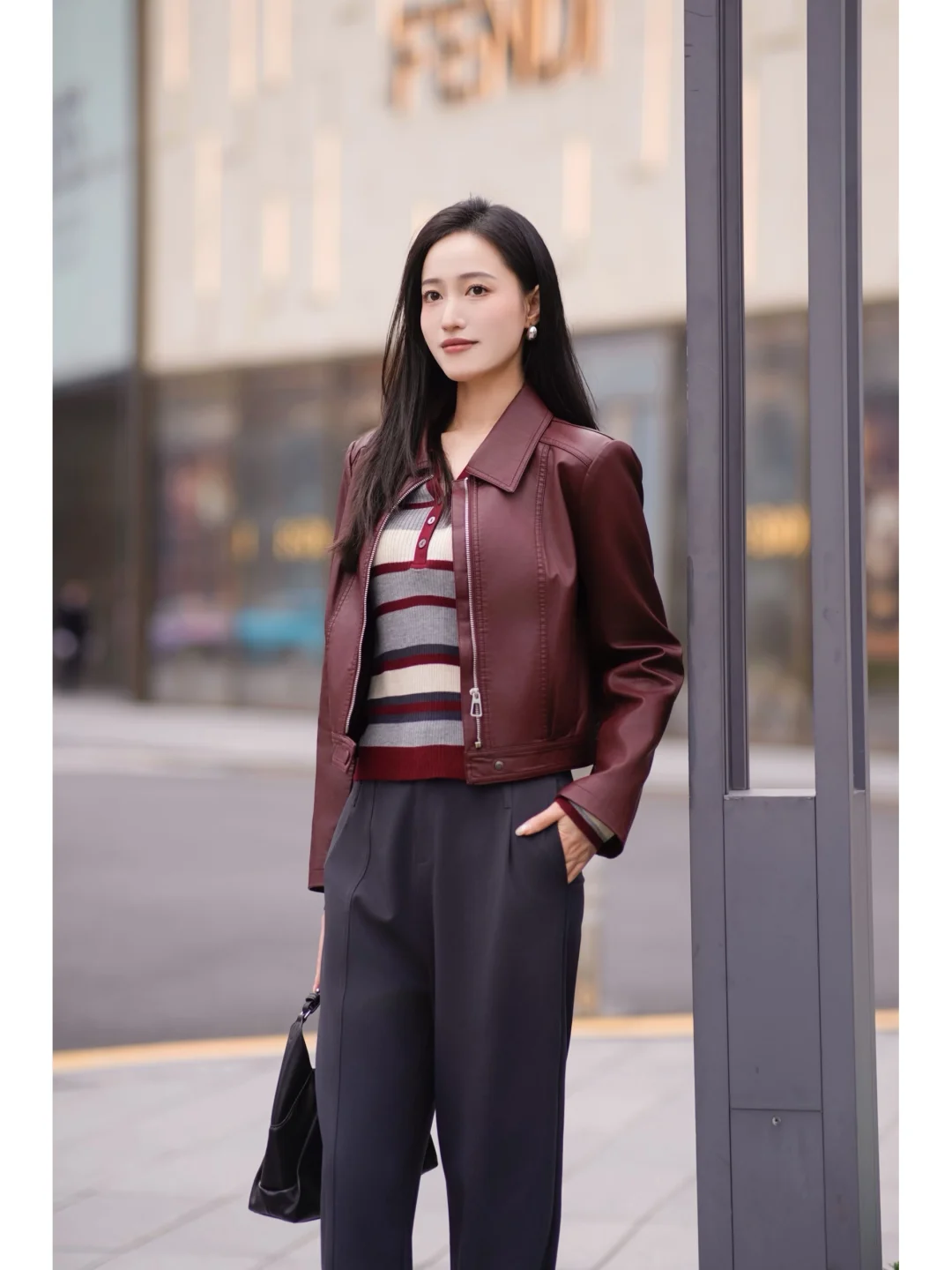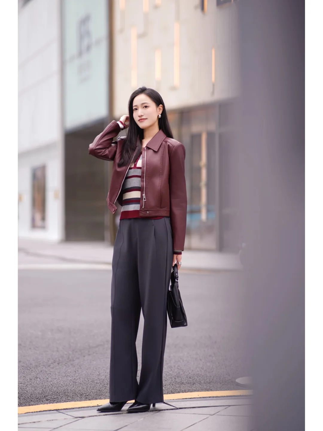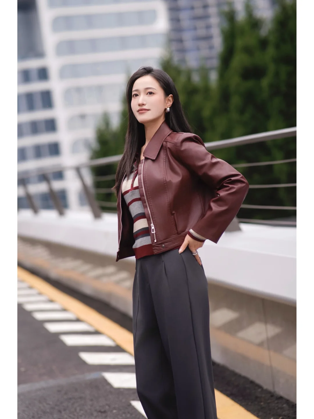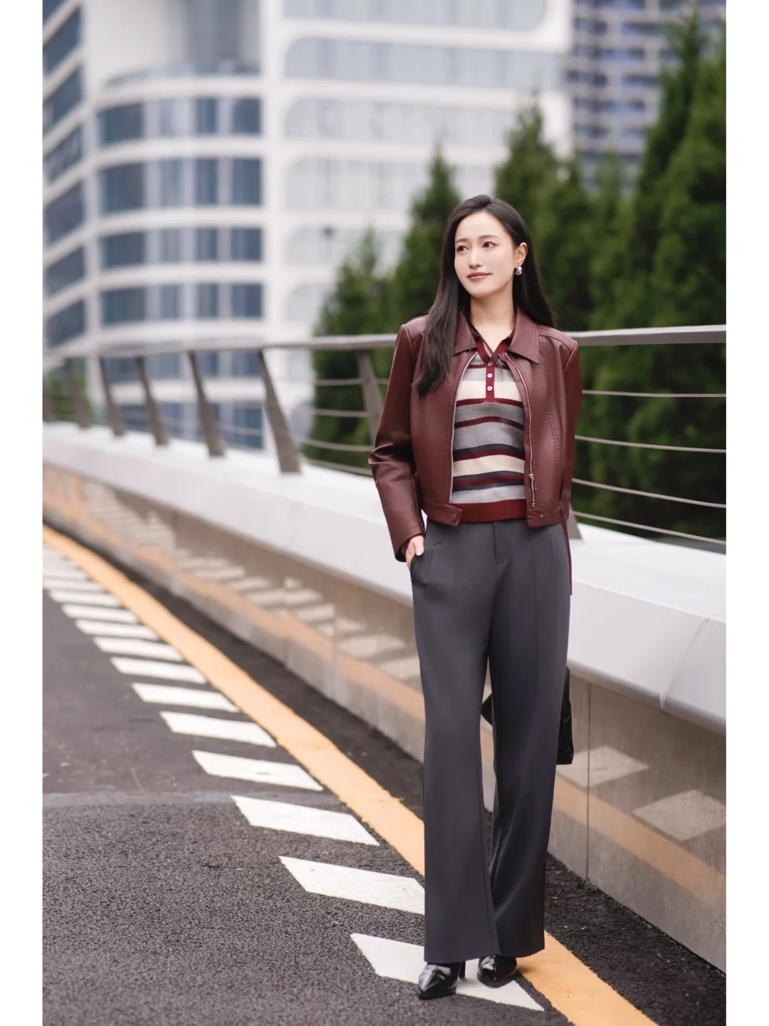 安克拉红又有点枫叶红的感觉 和秋天统一了色调~ 短款皮夹克外套 复古又有腔调 上身版型利落干练 又很好的拉高了腰线 搭配灰色系西装裤 优雅内敛的职场时髦感拿捏💼 穿行摩登都市 让通勤不再只是通勤 而是每一天属于自己的时尚秀场