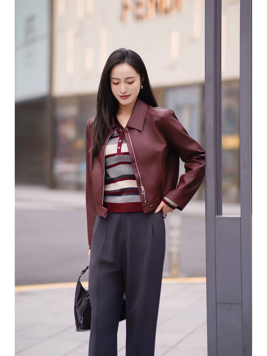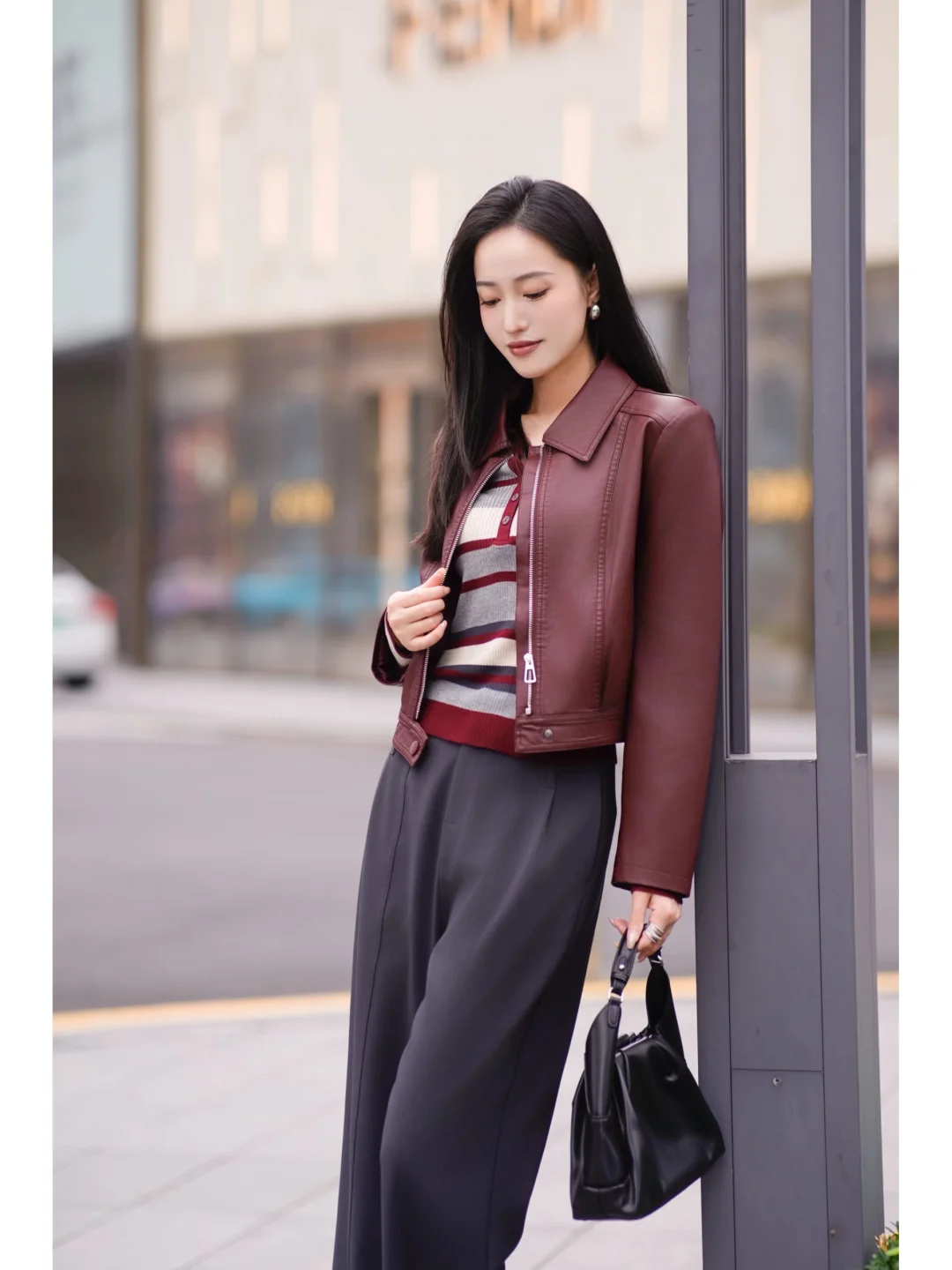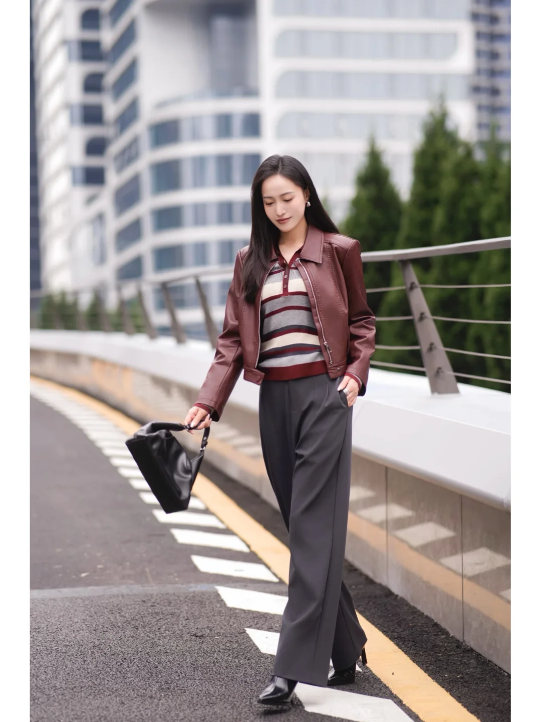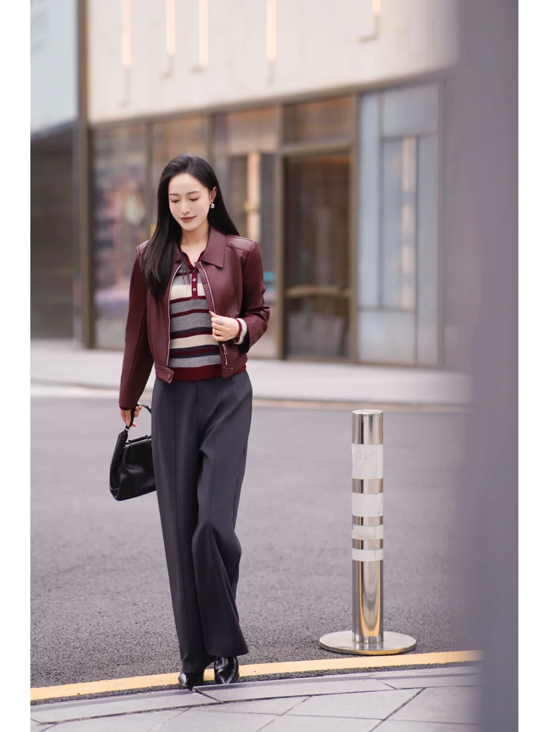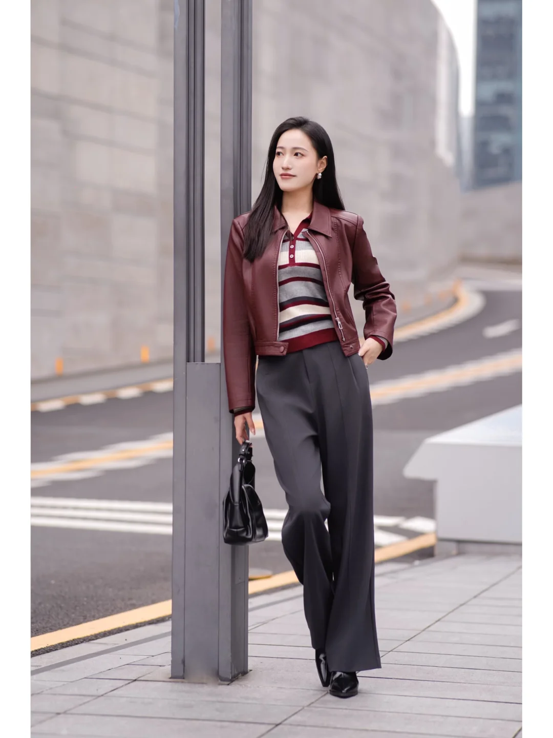 安克拉红又有点枫叶红的感觉 和秋天统一了色调~ 短款皮夹克外套 复古又有腔调 上身版型利落干练 又很好的拉高了腰线 搭配灰色系西装裤 优雅内敛的职场时髦感拿捏💼 穿行摩登都市 让通勤不再只是通勤 而是每一天属于自己的时尚秀场