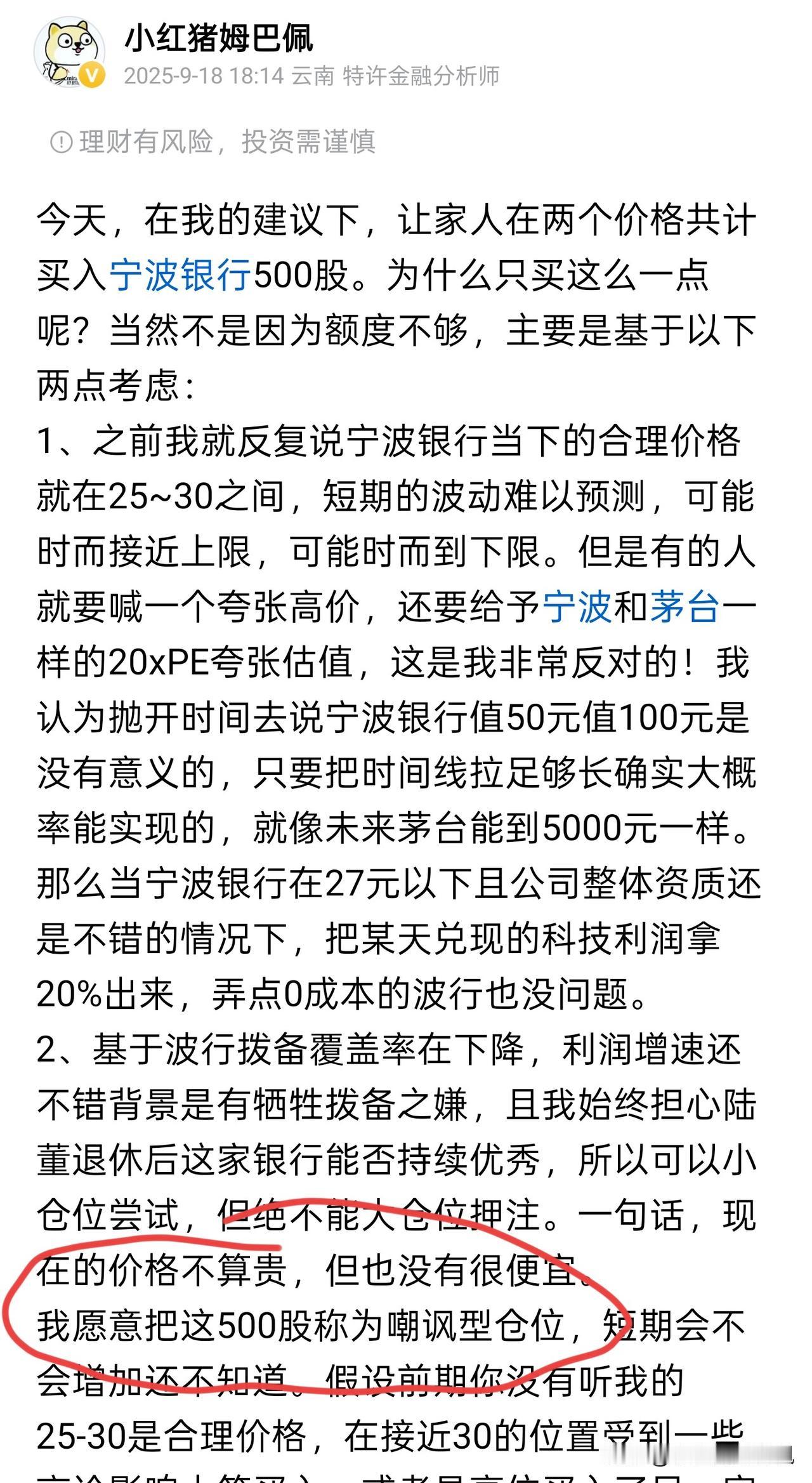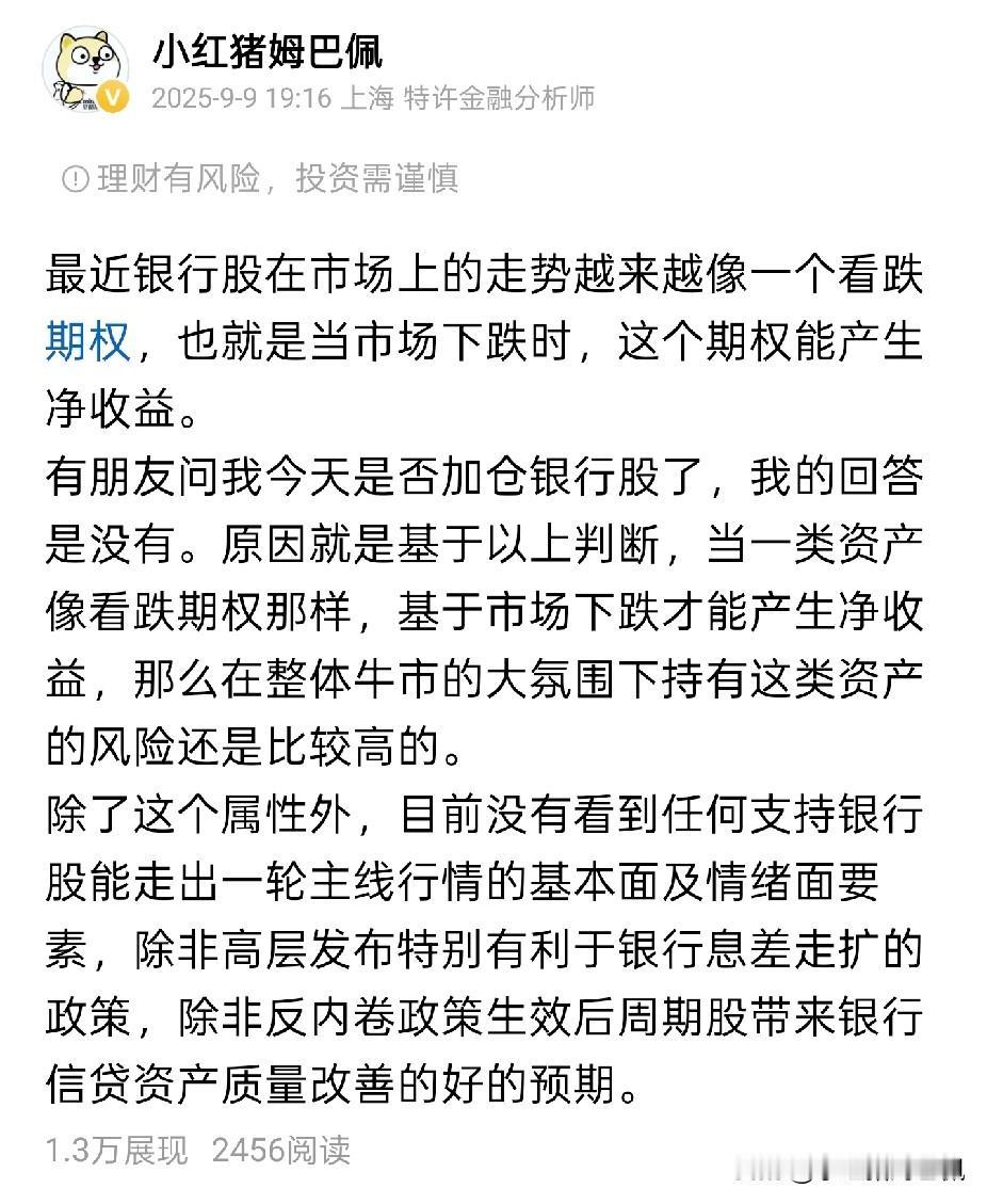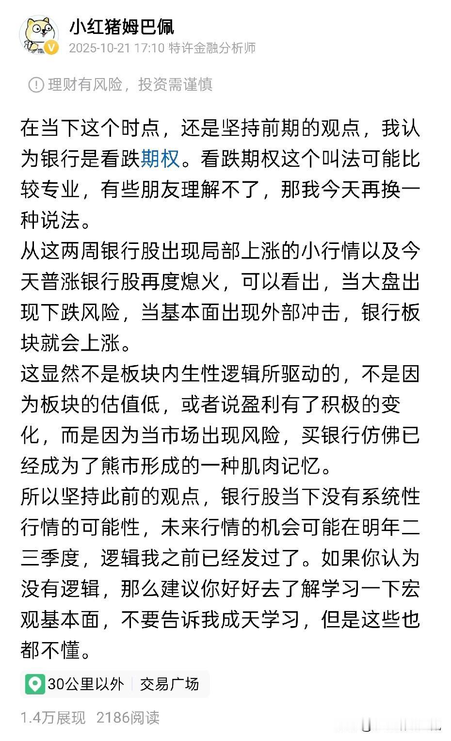 嘴上说千句万句,都不如市场先生给出交易价格这一句话有分量!---什么时候建议你碰这两家城商行? 一个多月前,我在宁波银行上建立了少量的仓位,我开玩笑说这是嘲讽型仓位(图4),当然好在宁波银行的质地在这几家城商行中还是最好的,这样的嘲讽型仓位也已经给我赚钱了。 没碰江苏银行和杭州银行的原因是,本来近期我就判断银行股没有系统性机会,只是一个看跌期权,会把银行股的总仓位加以控制。此外我写过一篇说觉得杭州银行没行长,战略定位业务开展路径不清晰的文章,江苏银行我觉得资产业务中,江苏省内城投含量过高,所以连“嘲讽型仓位”都懒得建。事实也证明宁波银行比另外两家略微优秀一些,至少今天的局面下更抗跌一些! 我并不是真正要嘲讽谁,我只是觉得既然号称爱研究天天研究,且只研究这一个行业,理应水平更高一些。但是从文字和视频内容来看,研究深度很浅,且还有很多误区,对银行业务的了解,似乎连机构的研究助理研究实习生都比不上,有点与自己的标榜宣传不太符合。出于对自己的粉丝负责,还应当多听听别人的意见,好好提高水平,而不是一律觉得别人黑子。当然是有一部分黑子,但是像我这样的绝对是忠言逆耳,利于你提高,利于你的粉丝提高。 继续维持当下银行股整体是看跌期权且系统性行情要到明年二季度左右的观点(图6、7)。本轮科技引领的行情如果到4200点左右(只是阶段性高点,后续科技会在业绩不断兑现,估值不断提升中继续站上一个又一个新高),那么先看江苏银行在10元左右,杭州银行在15元左右,再考虑用科技的利润去买一些小仓位,这是我给大家的建议!