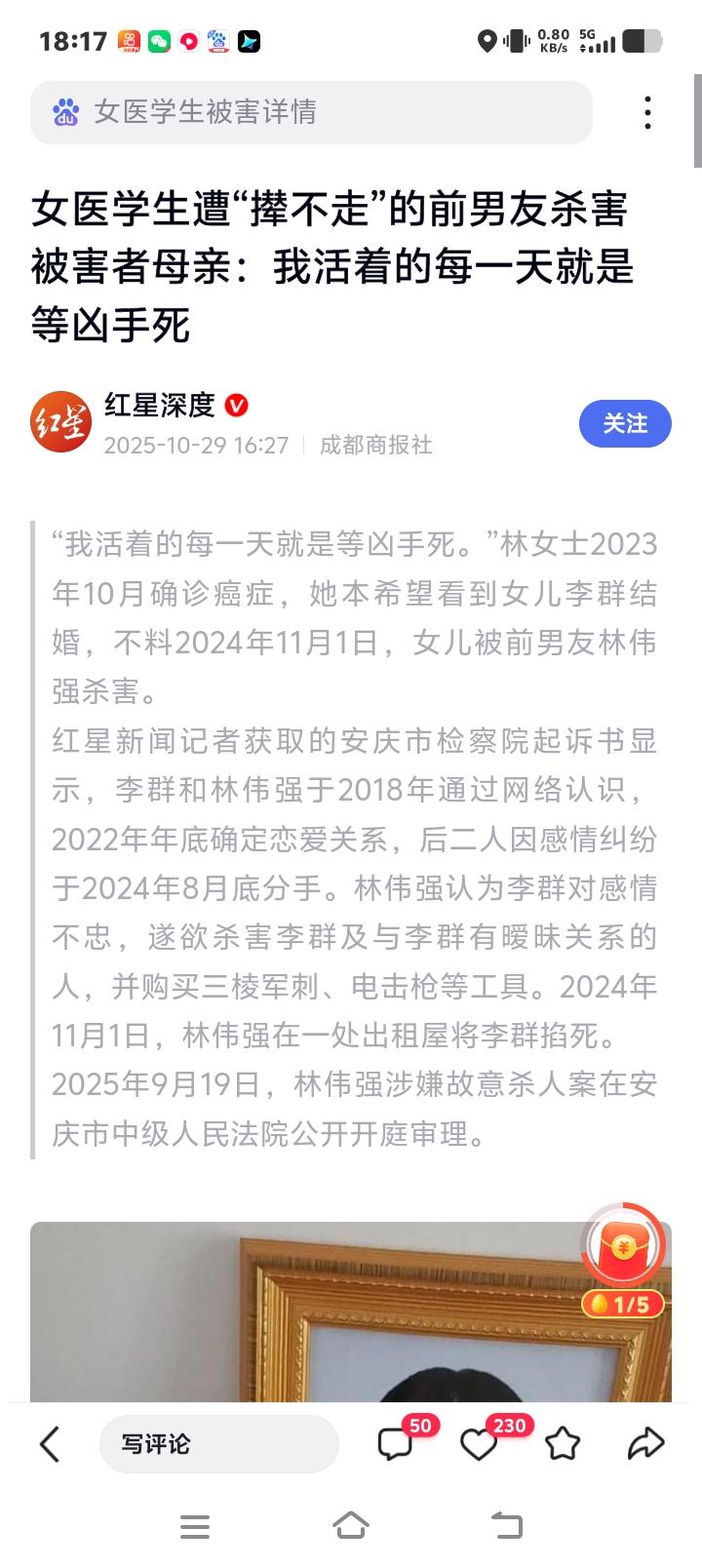 安庆22岁女医学生被前男友掐死出租屋!母亲患癌苦等死刑判决,原生家庭之痛如何毁掉一个拼命向上的女孩? 那个秋天本该装满考研资料和婚纱梦的行李箱,如今只剩下殡仪馆的编号牌。林女士用颤抖的手抚过女儿李群的证件照,鼻咽癌放疗的后遗症让她必须紧贴相框才能看清女儿的笑容——“我活着的每一天就是等凶手死”,这句从癌痛躯体里榨出的誓言,在安庆潮湿的空气里凝固成刺人的冰棱。 谁能想到四年前收到安徽医科大学录取通知书的女孩,会在毕业前被初恋扼杀在出租屋的水泥地上?从专升本到备战考研,这个农村姑娘总在凌晨五点的晨光里啃着面包背单词,微商创业的亏损压弯过她的脊背,却从未折断她眼里的光。直到遇见那个“撵不走”的男人,她的人生剧本被血渍改写。 爱情最初裹着蜜糖。2018年网络相识的林伟强曾让李群尝到温暖,可当女孩的电商公司渐有起色,男友却活成了寄生藤蔓。闺蜜张某目睹过太多深夜争吵——男人跪在地上自扇耳光求原谅,转身又理直气壮索要烟钱,甚至让备考的姑娘给他热饭洗碗。 更可怕的控制发生在经济层面。为给患癌母亲争取低保待遇,李群将公司转入男友名下,这个决定成了勒住她脖颈的绳索。分手后账户冻结的窘迫里,她连吃饭都要向闺蜜借钱,而林伟强却握着财产继续酗酒度日,像潜伏在阴影里的毒蛇。 “他两年没工作还挑三拣四”“动不动就跪着不走”——这些微信吐槽如今读来字字泣血。姑娘试过用200万欠条激励对方奋斗,试过安排健身教练工作,甚至通过相亲试图切断关系,但偏执者早已把占有欲炼成刀锋。2024年11月1日的出租屋里,三棱军刺的寒光不及掐在颈间的双手冰冷。 遇害当天清晨,李群刚让母亲帮忙拍户口本办理考研确认。她计算着还剩49天冲刺的倒计时,不知道有人正在调试电击枪。当现男友在高铁站迟迟等不到人时,16℃的空调正对着床底逐渐僵硬的躯体吹拂,就像那个永远停在22岁的梦想。 此案揭开当代亲密关系中的隐形獠牙。当“下跪求复合”成为情感绑架的套路,当经济控制蚕食着独立人格,多少女孩还在用善良豢养恶魔?林女士化疗时没哭,却在案发现场外崩溃——她本想看女儿穿婚纱冲喜,等来的却是刑事科学技术研究所的尸检报告。 司法鉴定击碎了凶手伪装精神病的企图,但判决能抚平母亲破碎的人生吗?殡仪馆里冻着的不止是青春遗体,还有千万家庭对情感教育的反思。如果当初有人教会女孩及时止损,如果社会能早识别出PUA式求和的危险性…… 站在安庆医专的校门口,晚风依旧会吹过考研自习室的窗帘。总有人记得那个总在黎明前起床的姑娘,她曾在创业失败时咬牙还清20万借款,在母亲病榻前伪装轻松,却没能挣脱以爱为名的绞索。此案将于近期宣判,我们等待法律斩落正义之剑。 (来源:红星新闻、当事人访谈记录及司法文书) 情感力量 女性安全