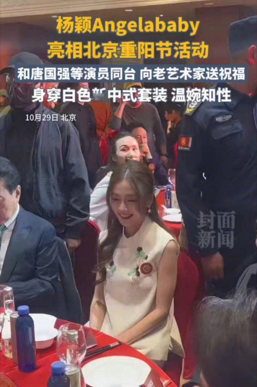 Angelababy亮相重阳节敬老活动Angelababy身着月白色新中式套装亮相北京敬老活动,与唐国强等同台,温柔慰问李启明等老艺术家,被夸时腼腆微笑,尽显温婉。