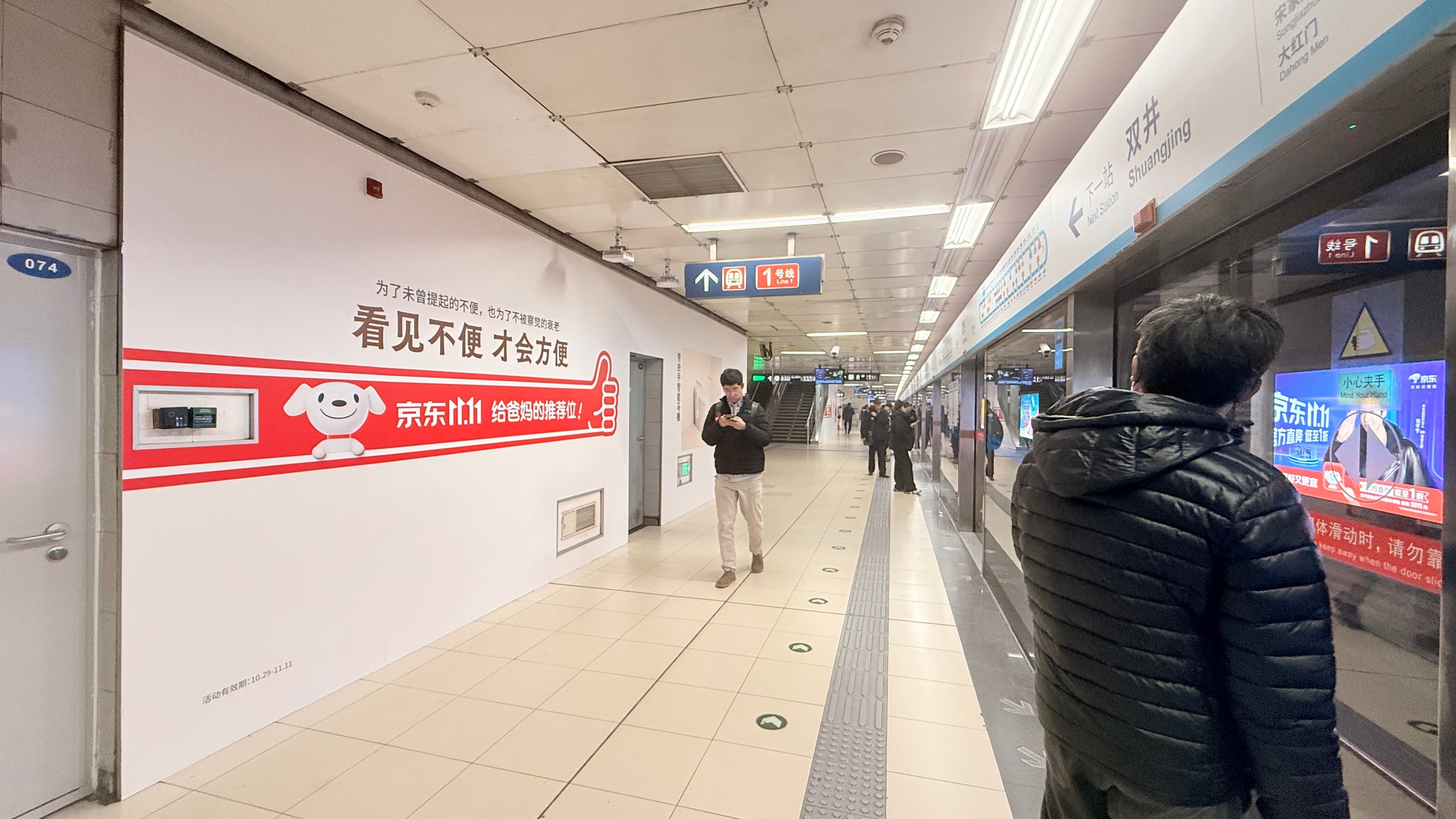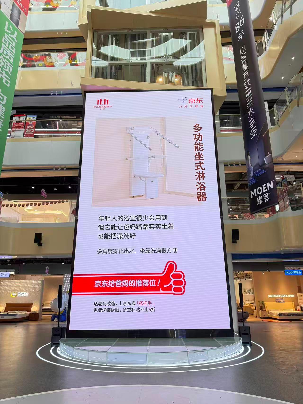 线下也能看到他们的广告——写的不是什么“敬老口号”,而是切合生活的“看见不便才会方便”。这个重阳节,京东把黄金广告位都留给了这件事。
