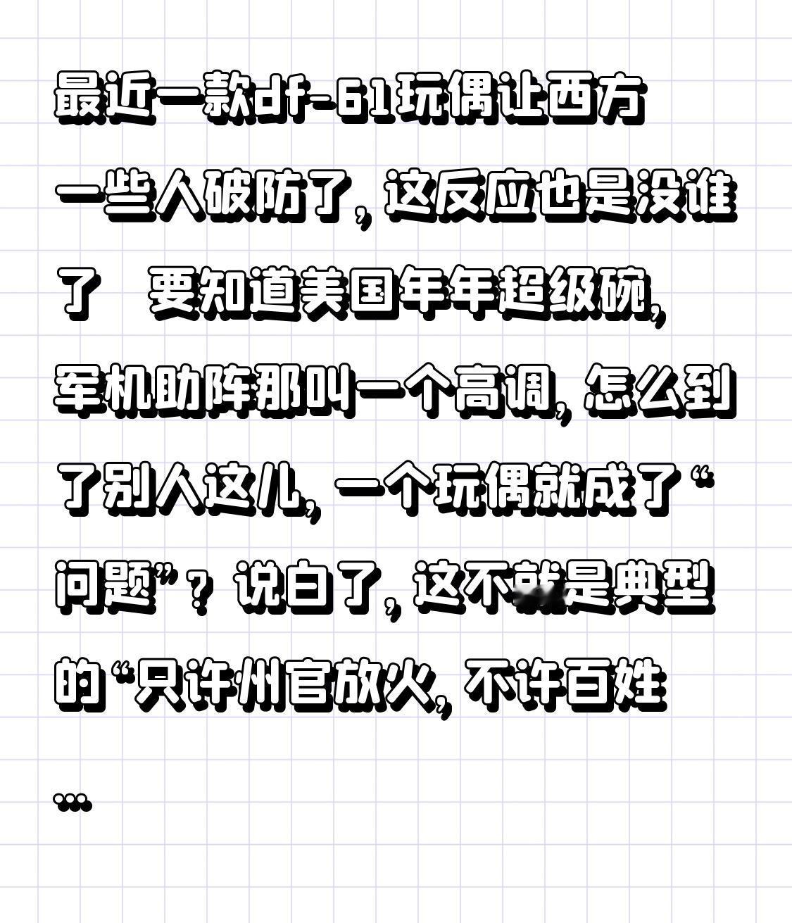 最近一款df-61玩偶让西方一些人破防了,这反应也是没谁了~ 要知道美国年年超级碗,军机助阵那叫一个高调,怎么到了别人这儿,一个玩偶就成了“问题”?说白了,这不就是典型的“只许州官放火,不许百姓点灯”嘛,双标玩得也太溜了。 西方双标现场 美式双标有多离谱61导弹 东方61洲际 61z 东风df-61 中国玩偶 美国玩偶 rt61