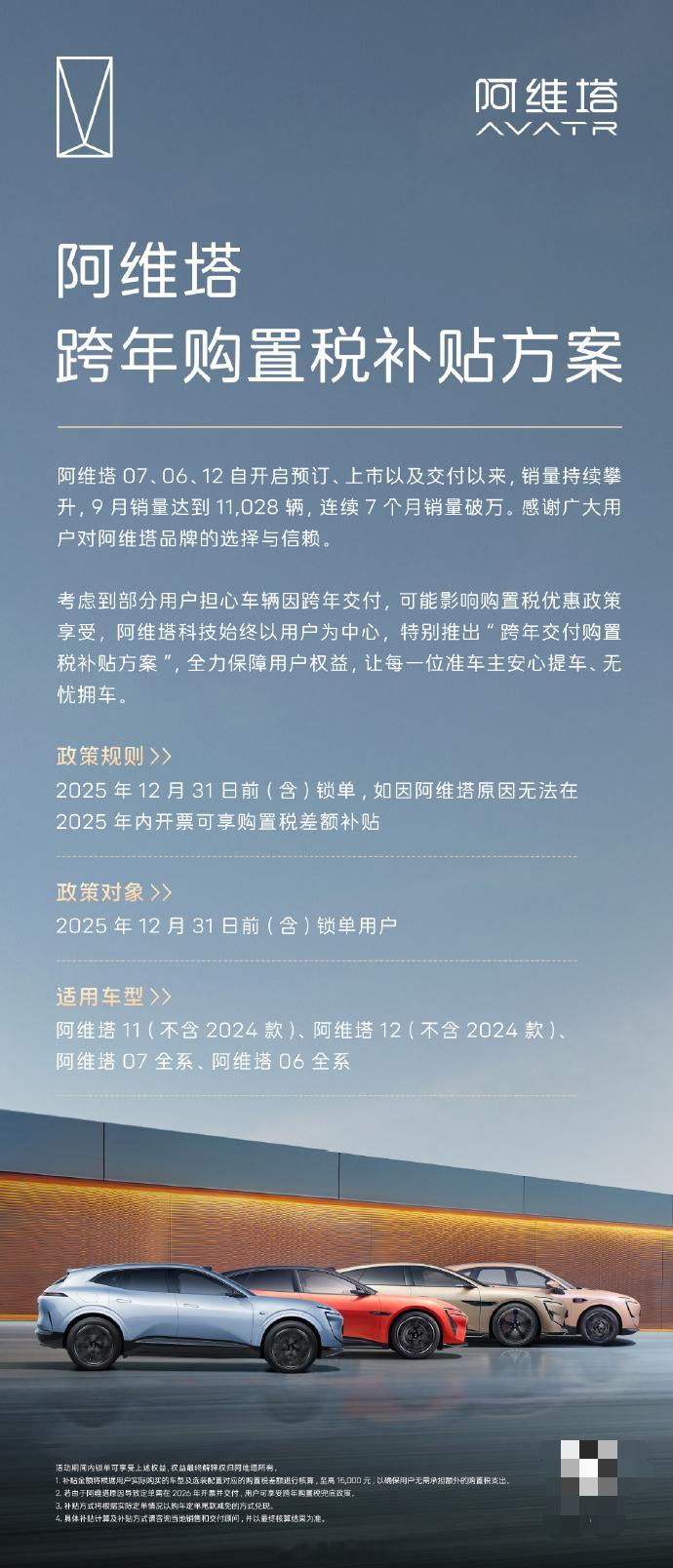 突然发现阿维塔推出的购置税补贴跟别家不太一样,别家最晚都是 11 月底前锁单可以有购置税补贴,阿维塔只要 12 月 31 日前(含)完成锁单,2026 年才交付的话就可以领购置税补贴。这是什么缘故?
