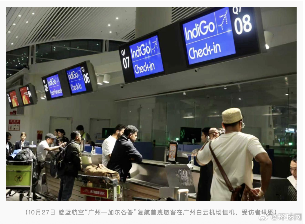 另据媒体公开报道,印度靛蓝航空已于10月26日率先开通加尔各答至广州的每日直飞航班,成为首家恢复印度至中国大陆定期航班的印度航司。据该航司称,自11月10日起,该航司还将新增德里至广州每日航班。