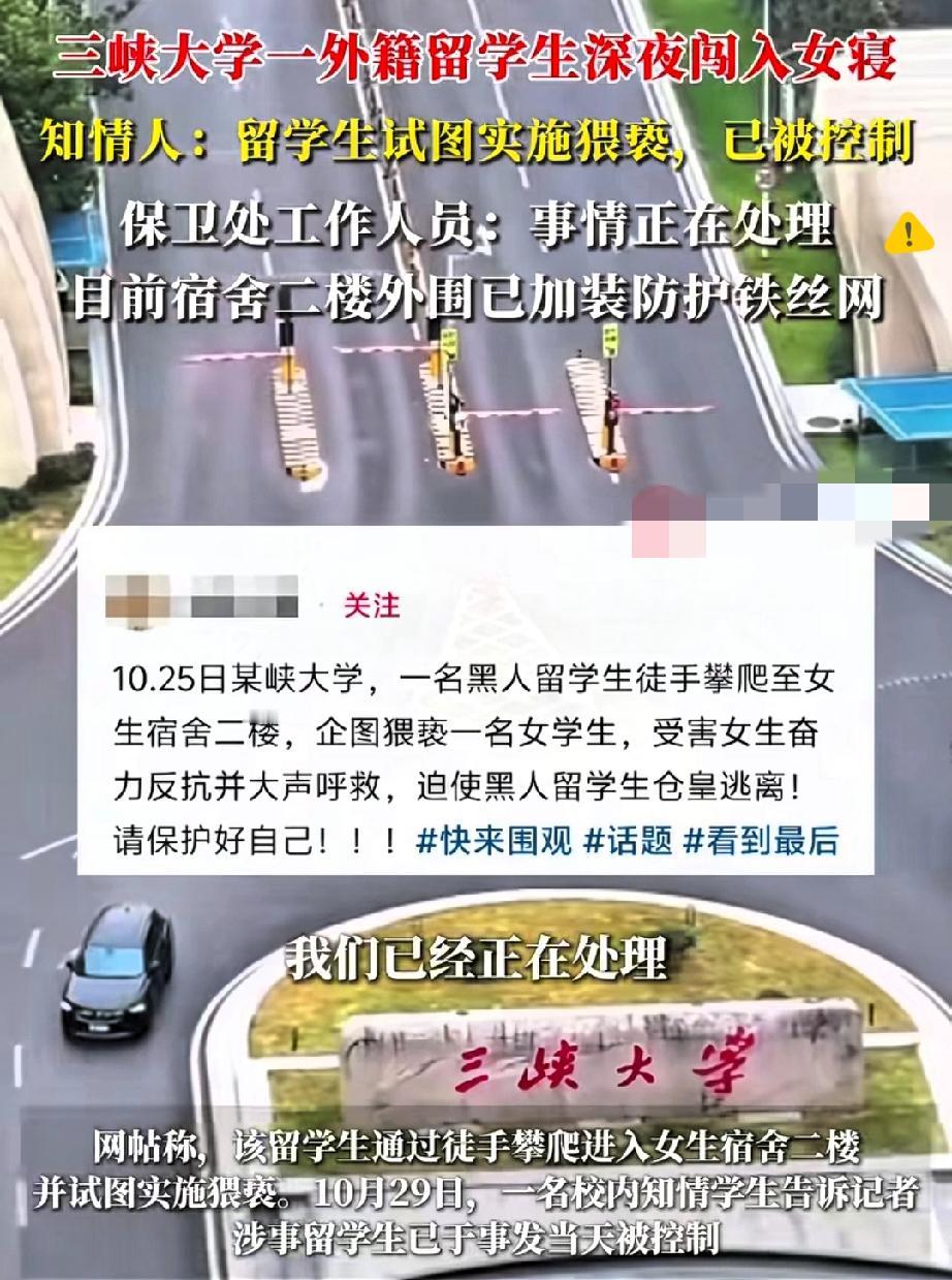 黑人外籍学生翻墙闯女生宿舍这事儿,细想全是不对劲的地方! 他明知道正常流程进不去,还敢硬闯,心里头打的什么算盘简直明摆着。 怕不是早就认定自己“特殊”,觉得就算被抓了,学校也只会轻拿轻放,最多说两句就完事? 这种仗着身份搞特殊的心思,才让他敢这么肆无忌惮。 可他千算万算没算到,不仅被直接刑拘,学籍都给开了! 这结果真叫一个大快人心,直接打破了某些人心里的“特权幻想”—— 在中国,不管你来自哪个国家,犯了法就和咱们普通人一样,没有谁能搞特殊。 以前总听说有些外籍留学生被“特殊对待”惯坏了,这次算是给所有人提了个醒:法律面前从来没有例外。 你觉得,这事会不会让那些心存侥幸的人彻底收起歪心思?