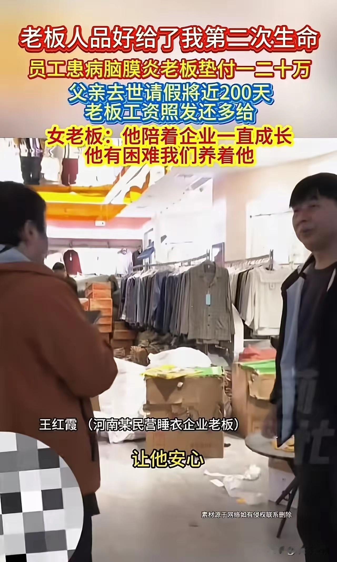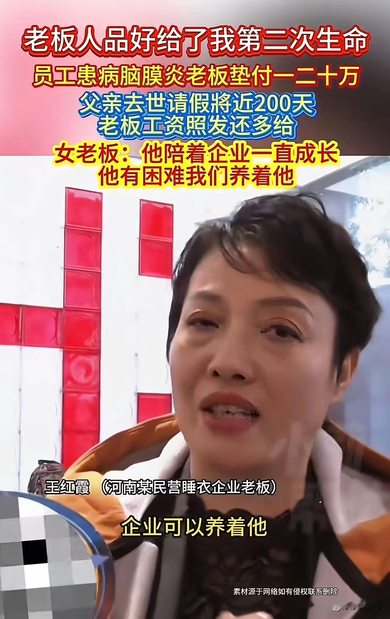 近日,一则“好老板”的故事在网络上引发热议,令无数网友为之动容。故事的主人公是一位女老板,她以实际行动诠释了何为真正的责任与关爱。 事情源于员工的父亲突然因病离世。面对这突如其来的变故,该员工请假超200天,近乎半年之久。在很多企业里,长时间请假或许意味着被辞退,但这位女老板并未如此。她不仅没开除员工,还坚持按时发放工资,尽显对员工的人文关怀与责任感。这份理解与支持,让员工深受感动,在困难时刻体会到了家一般的温暖。 然而,故事并未就此画上句号。员工身体还未完全恢复时,又不幸患上脑膜炎,情况十分危急。面对员工的病情,女老板毫不犹豫,主动垫付了一二十万元医药费,为员工争取到了宝贵的治疗时间。她的善举不仅挽救了员工的生命,也让其重新燃起了生活的希望。 员工对女老板赞誉有加:“老板人品好,给了我第二次生命!”这句话道出了他内心的感激与敬佩。对他来说,这位女老板不只是企业领导,更似亲人,是在他最艰难时伸出援手的恩人。她的善良与责任心,让员工感受到企业的温度,也让人们看到了企业文化中最珍贵的人性光辉。 女老板则谦逊地表示:“他陪着企业一路成长,他有困难我自然要照顾他。”这句话充分彰显了她的胸怀与责任感。她认为,企业不只是追逐利润的场所,更是一个大家庭,成员间应相互扶持、共同成长。她用行动证明,善待员工不仅是企业的责任,更是企业长远发展的根基。 这个故事引人深思。在快节奏的商业社会里,我们或许更需要多一些像这位女老板般的善良与责任。真正的企业不应只追求经济利益,更应成为传递温暖与正能量的载体。唯有用心关怀员工,企业才能赢得长久的信任与支持。 这位女老板的故事也提醒我们,每个人都可能在生命中遭遇困境,而善良和责任心,或许就是我们最宝贵的财富。她用行动诠释了何为真正的领袖精神,也让我们坚信,善良和责任能让社会变得更加温暖美好。