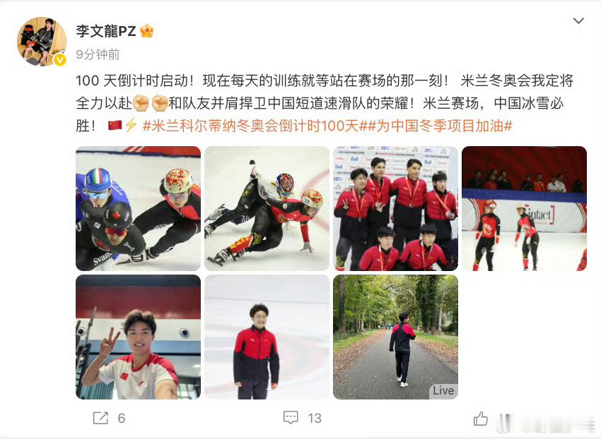 倒计时100天之际,发博展望米兰冬奥会:100 天倒计时启动!现在每天的训练就等站在赛场的那一刻! 米兰冬奥会我定将全力以赴[拳头][拳头]和队友并肩捍卫中国短道速滑队的荣耀!米兰赛场,中国冰雪必胜! 🇨🇳⚡