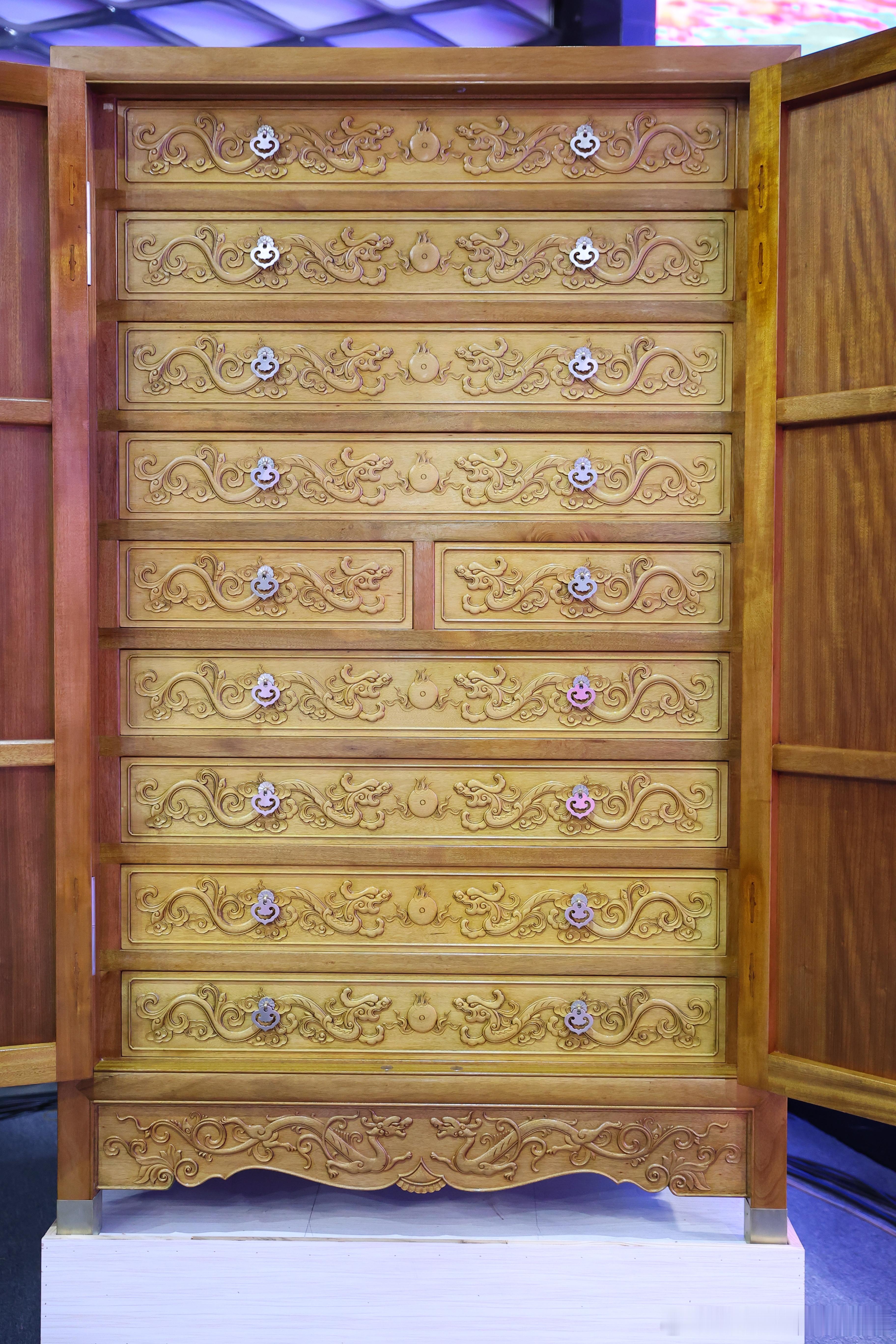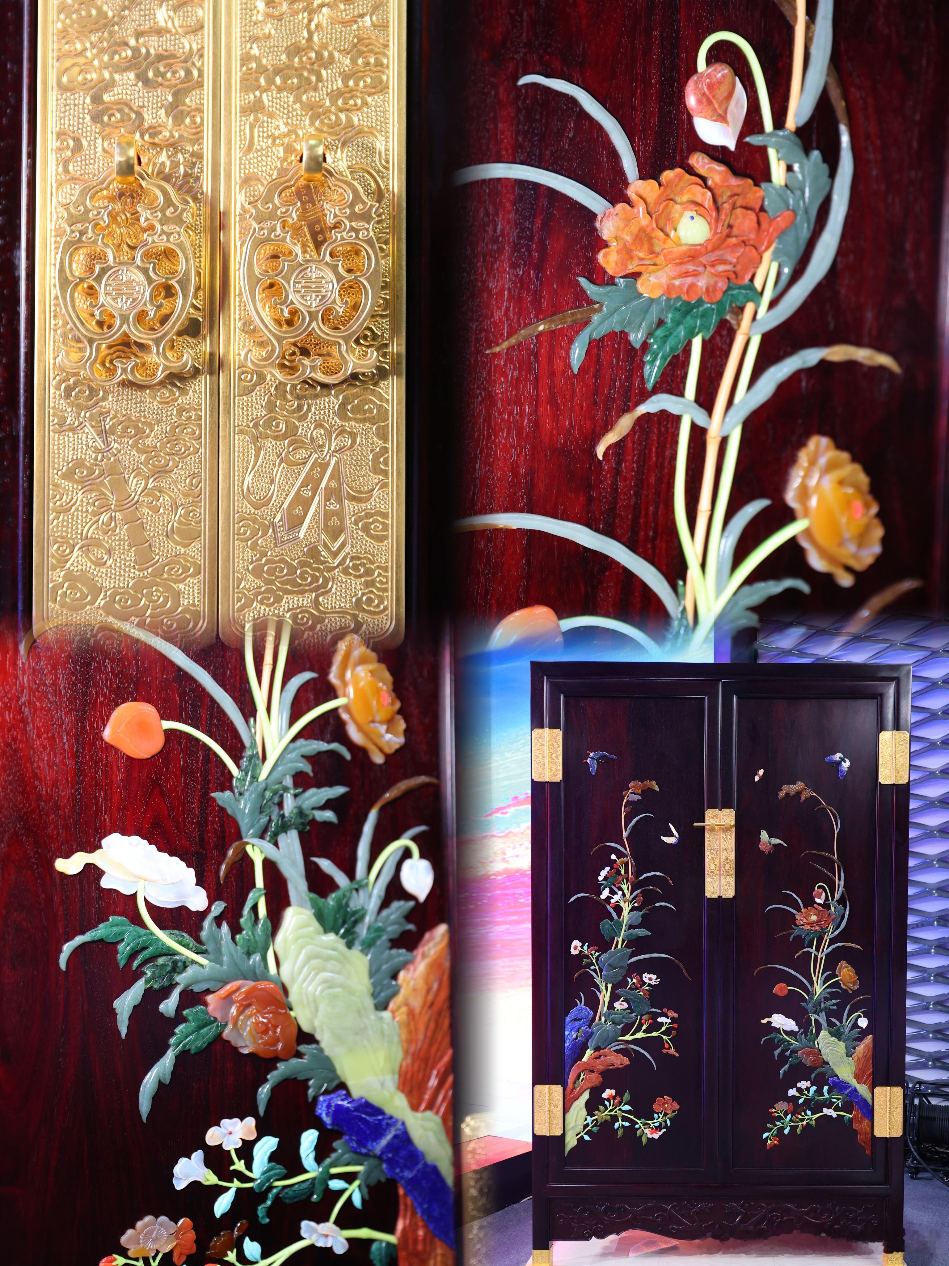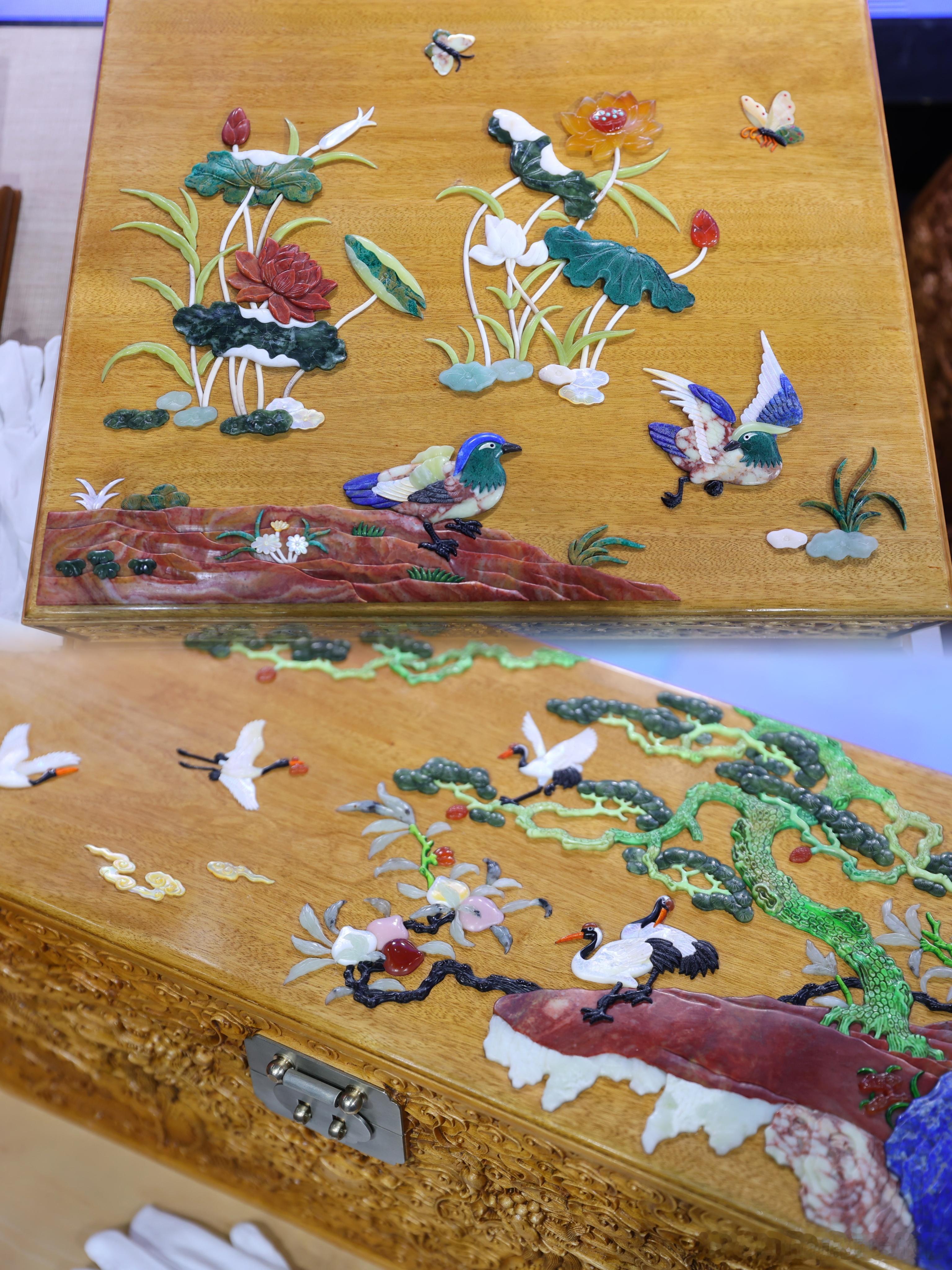 现场展示的复刻珍品令人震撼——国家级蚕丝织造大师复原出与明清御用丝绢98%相似的特制丝绢,荣宝斋裱画师还原皇家浆糊配方,百宝嵌大师用小叶紫檀、金丝楠木与玉石宝材打造“九层十屉”的皇家箱柜,每一处细节都凝聚了当代匠人的心血与敬意。